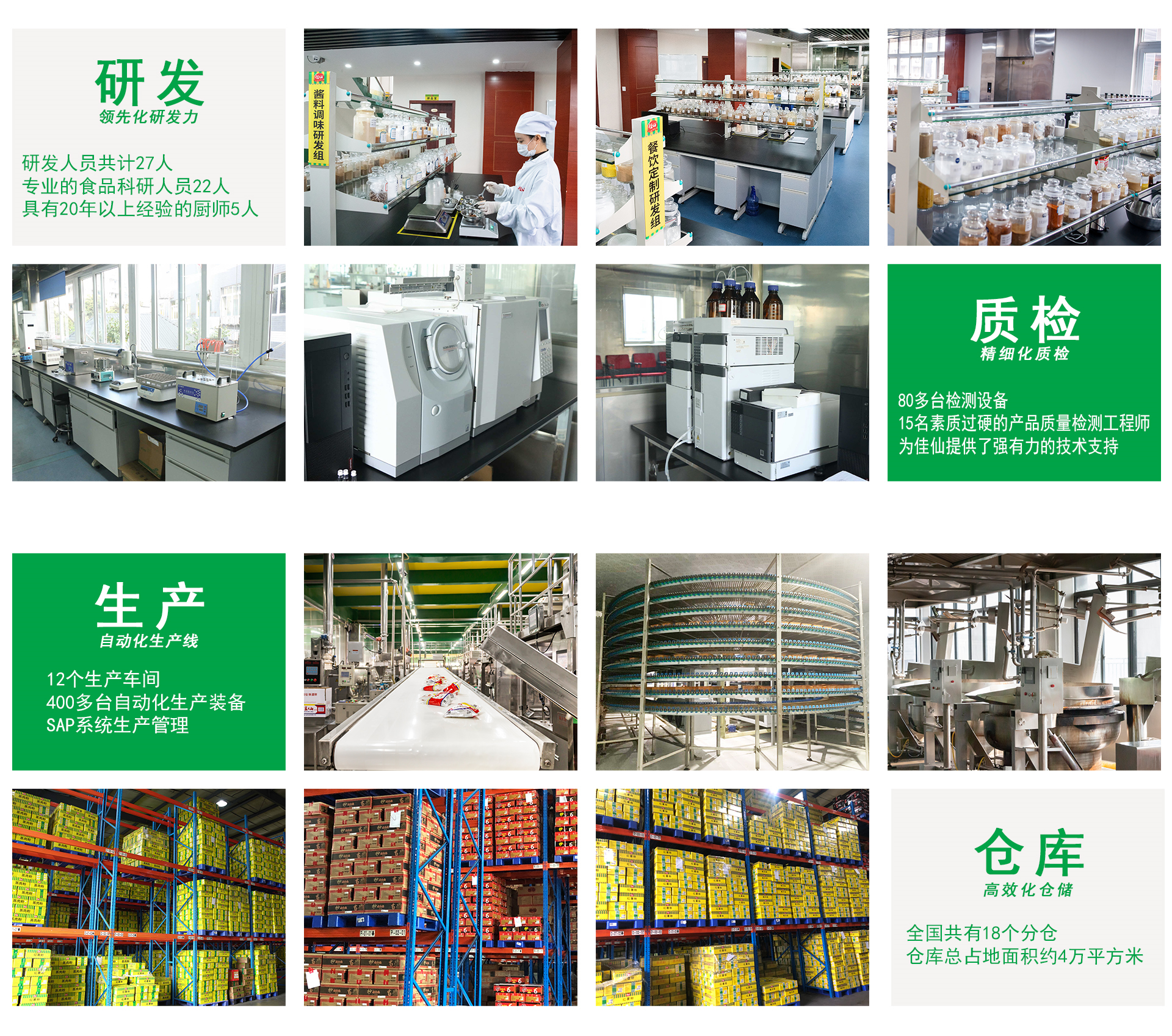 重慶佳仙食品有限公司成立于1997年,三位創(chuàng)始人以“一桿稱一臺(tái)封口機(jī)”開啟創(chuàng)業(yè)征程,從味精雞精為起點(diǎn),歷經(jīng)近30年的不懈奮斗,引領(lǐng)佳仙逐步發(fā)展為集研發(fā)、生產(chǎn)、銷售于一體的現(xiàn)代化食品公司,曾先后獲得重慶老字號(hào)企業(yè)、重慶市著名商標(biāo)、重慶市龍頭企業(yè)、全國質(zhì)量誠信示范企業(yè)等榮譽(yù)。目前佳仙擁有四大數(shù)智化生產(chǎn)基地、完善的物流體系、優(yōu)質(zhì)的原材料供應(yīng)基地,構(gòu)建了豐富多元的產(chǎn)品矩陣,涵蓋七大系列(鮮味調(diào)料、菜譜式調(diào)料、香辛料、基礎(chǔ)調(diào)料、甜品小吃、佐菜、熟食),共計(jì)200多個(gè)品項(xiàng),公司始終秉持“健康、美味、優(yōu)質(zhì)”的產(chǎn)品理念,用“味道”守護(hù)消費(fèi)者的美好生活,傳遞如家一般的溫暖。