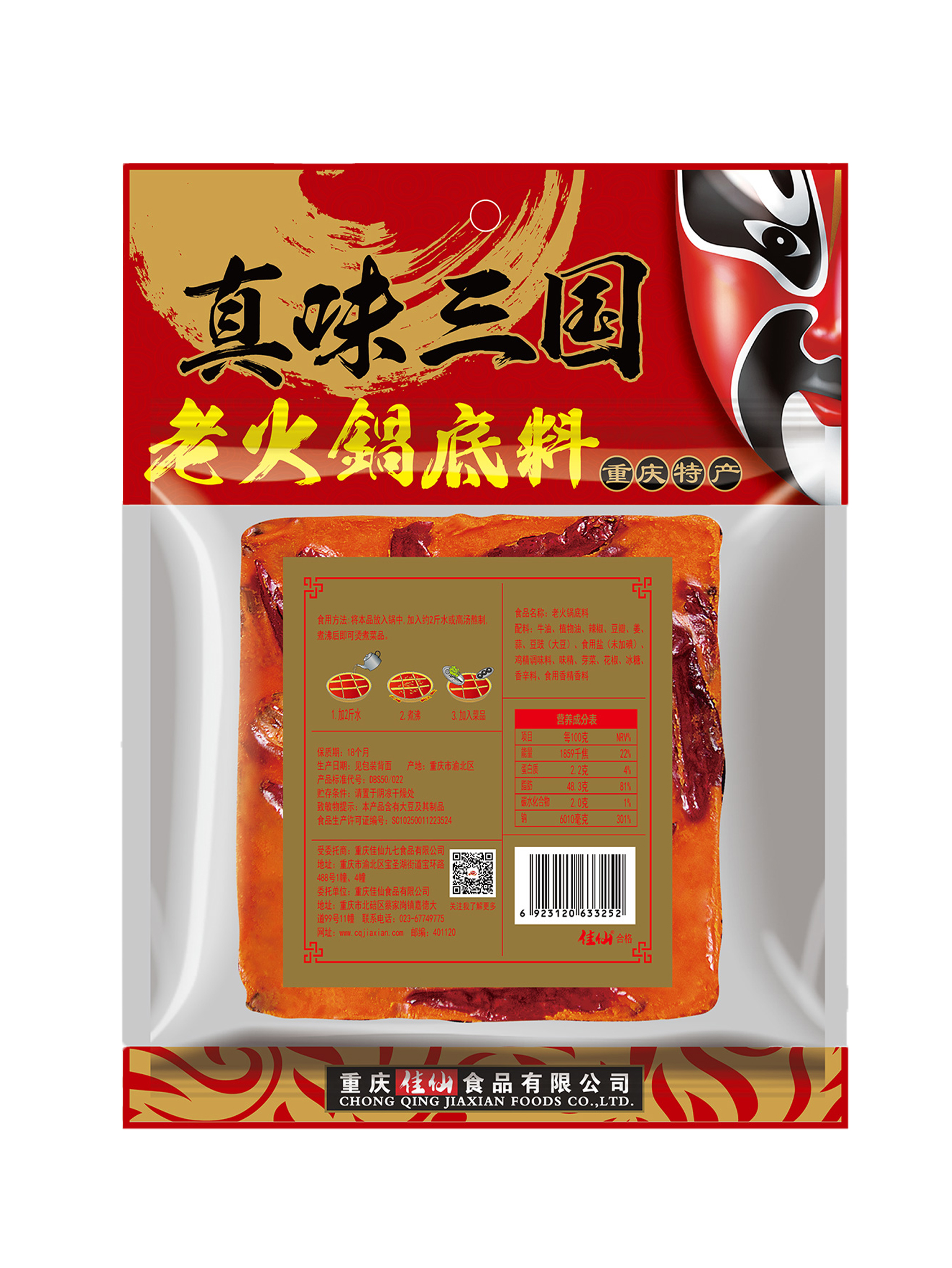佳仙火鍋底料是重慶非物質(zhì)文化遺產(chǎn),它源起朝天門碼頭的老字號火鍋店,底料配方經(jīng)過三代人的心手相傳延續(xù)至今。抄火鍋底料精選重慶本地產(chǎn)的紅辣椒、花椒、豆瓣、以及十多種香辛料,融合上等牛油,運(yùn)用獨(dú)家秘方熬制6小時(shí)以上。將新油熬出了老油的口感,還原了地道的重慶味。具有辣而不燥,麻辣并重,香醇濃郁,久煮不渾,回味悠長的特點(diǎn)。