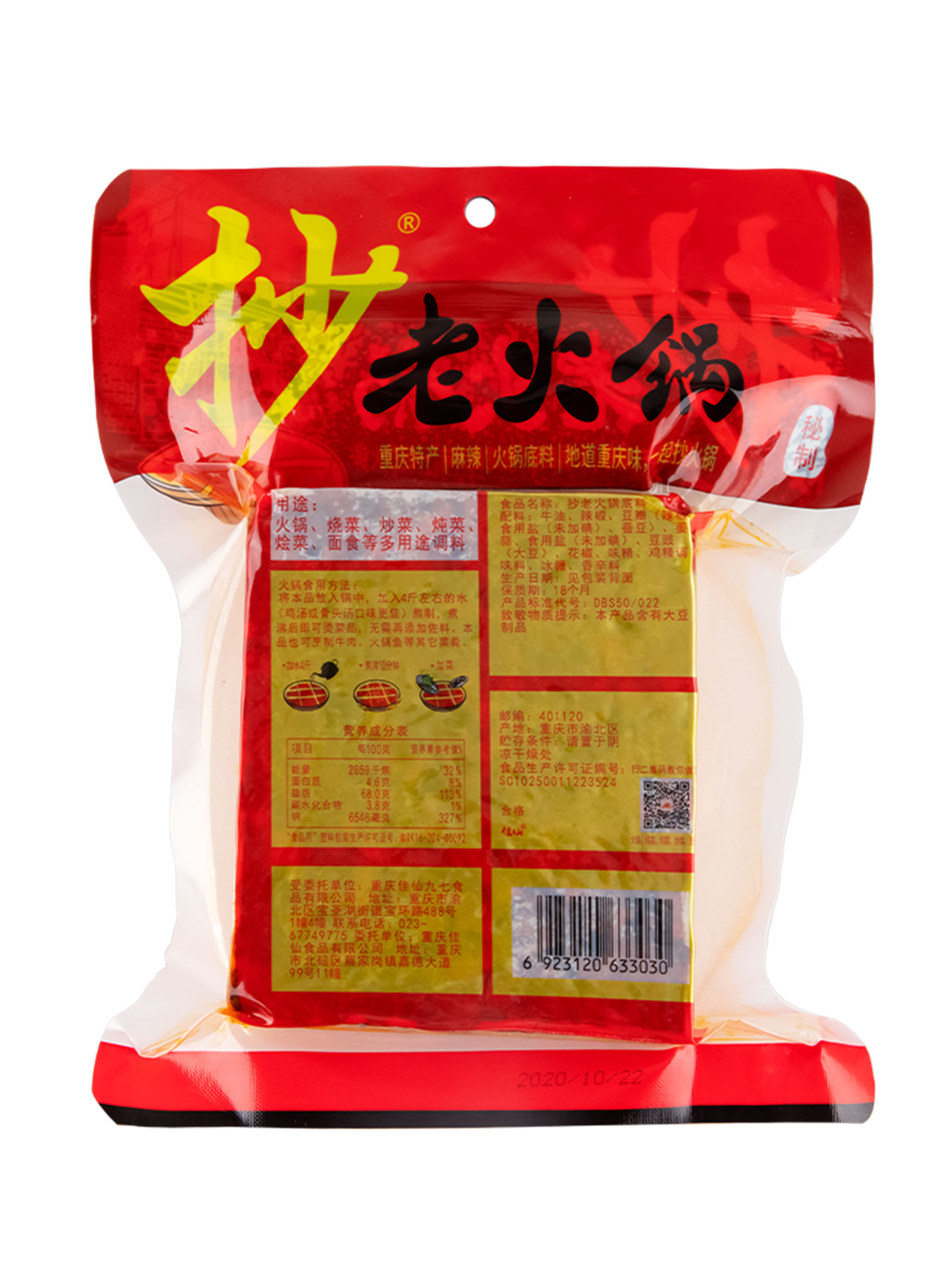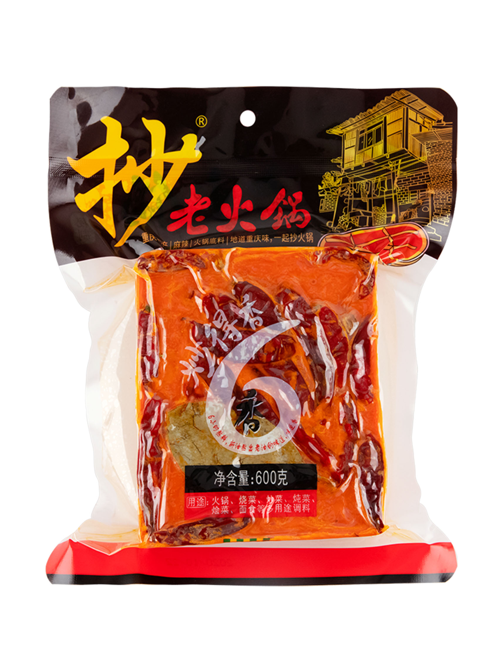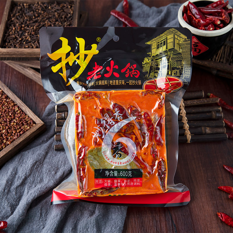 抄火鍋底料是重慶非物質文化遺產,它源起朝天門碼頭的老字號火鍋店,底料配方經過三代人的心手相傳延續至今。抄火鍋底料精選重慶本地產的紅辣椒、花椒、豆瓣、以及十多種香辛料,融合上等牛油,運用獨家秘方熬制6小時以上。將新油熬出了老油的口感,還原了地道的重慶味。具有辣而不燥,麻辣并重,香醇濃郁,久煮不渾,回味悠長的特點。