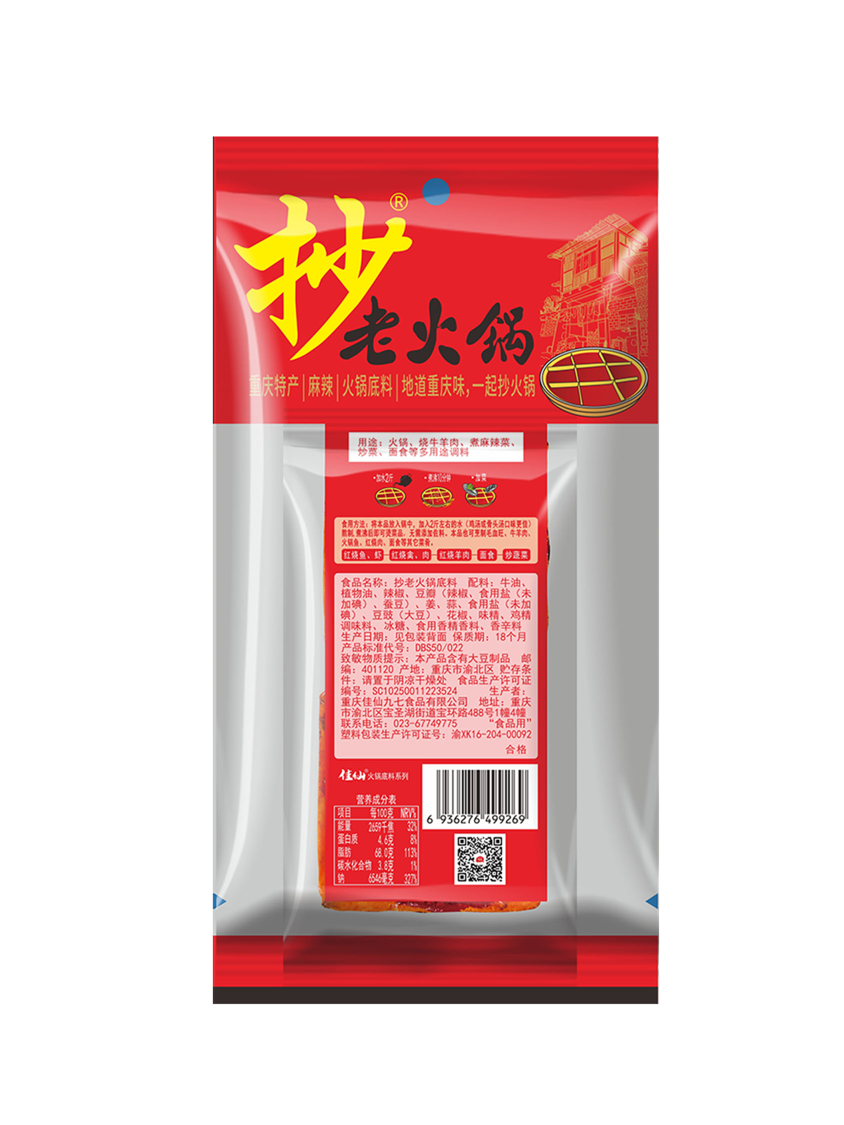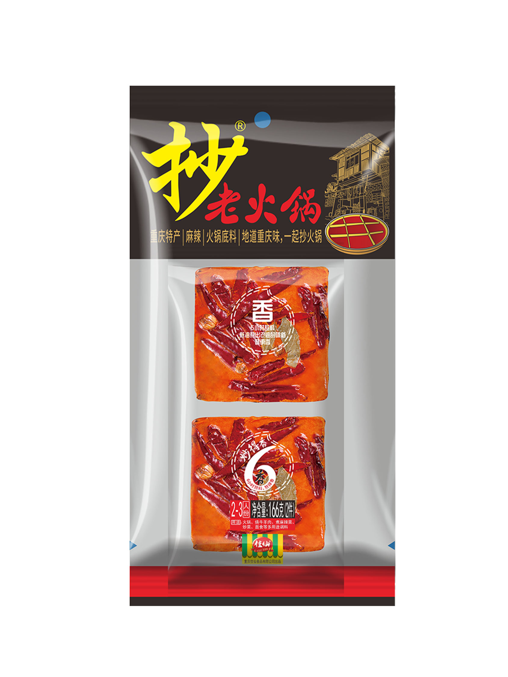 抄火鍋底料是重慶非物質(zhì)文化遺產(chǎn),它源起朝天門碼頭的老字號(hào)火鍋店,底料配方經(jīng)過三代人的心手相傳延續(xù)至今。抄火鍋底料精選重慶本地產(chǎn)的紅辣椒、花椒、豆瓣、以及十多種香辛料,融合上等牛油,運(yùn)用獨(dú)家秘方熬制6小時(shí)以上。將新油熬出了老油的口感,還原了地道的重慶味。具有辣而不燥,麻辣并重,香醇濃郁,久煮不渾,回味悠長的特點(diǎn)。