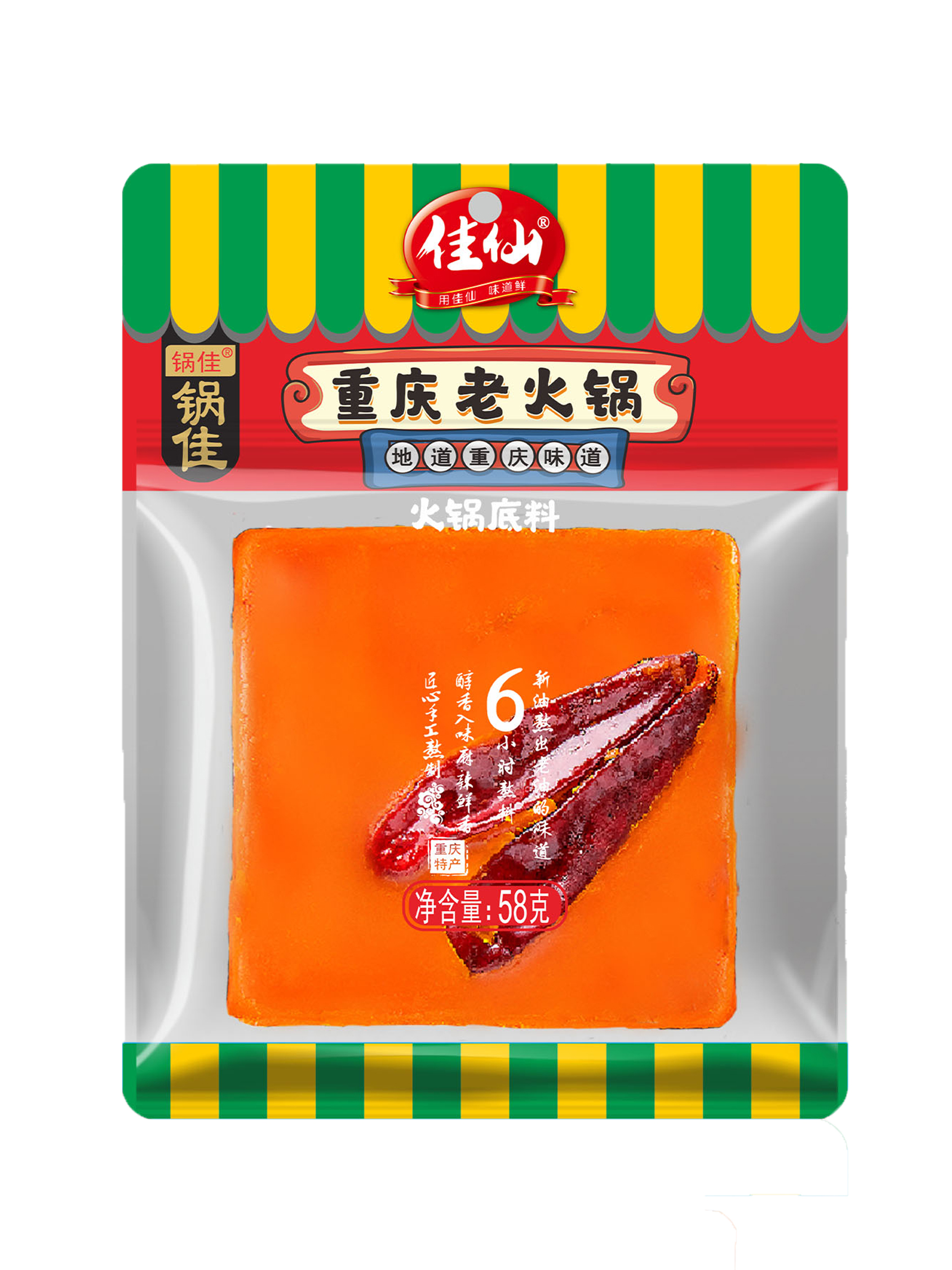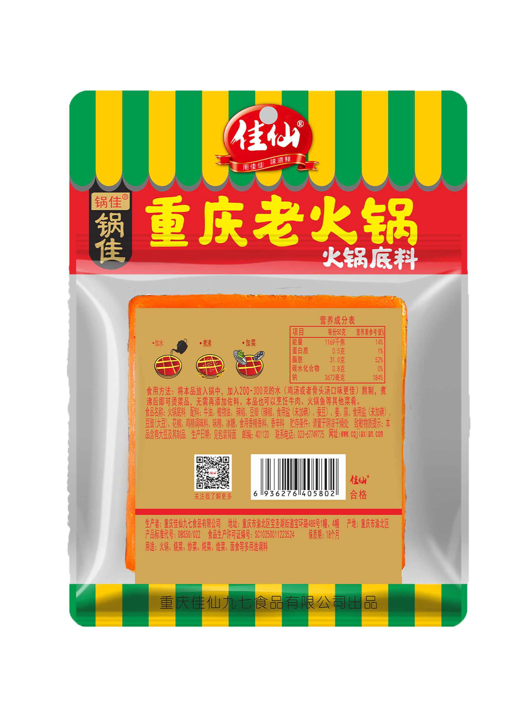 佳仙火鍋底料是重慶非物質文化遺產,它源起朝天門碼頭的老字號火鍋店,底料配方經過三代人的心手相傳延續至今。抄火鍋底料精選重慶本地產的紅辣椒、花椒、豆瓣、以及十多種香辛料,融合上等牛油,運用獨家秘方熬制6小時以上。將新油熬出了老油的口感,還原了地道的重慶味。具有辣而不燥,麻辣并重,香醇濃郁,久煮不渾,回味悠長的特點。