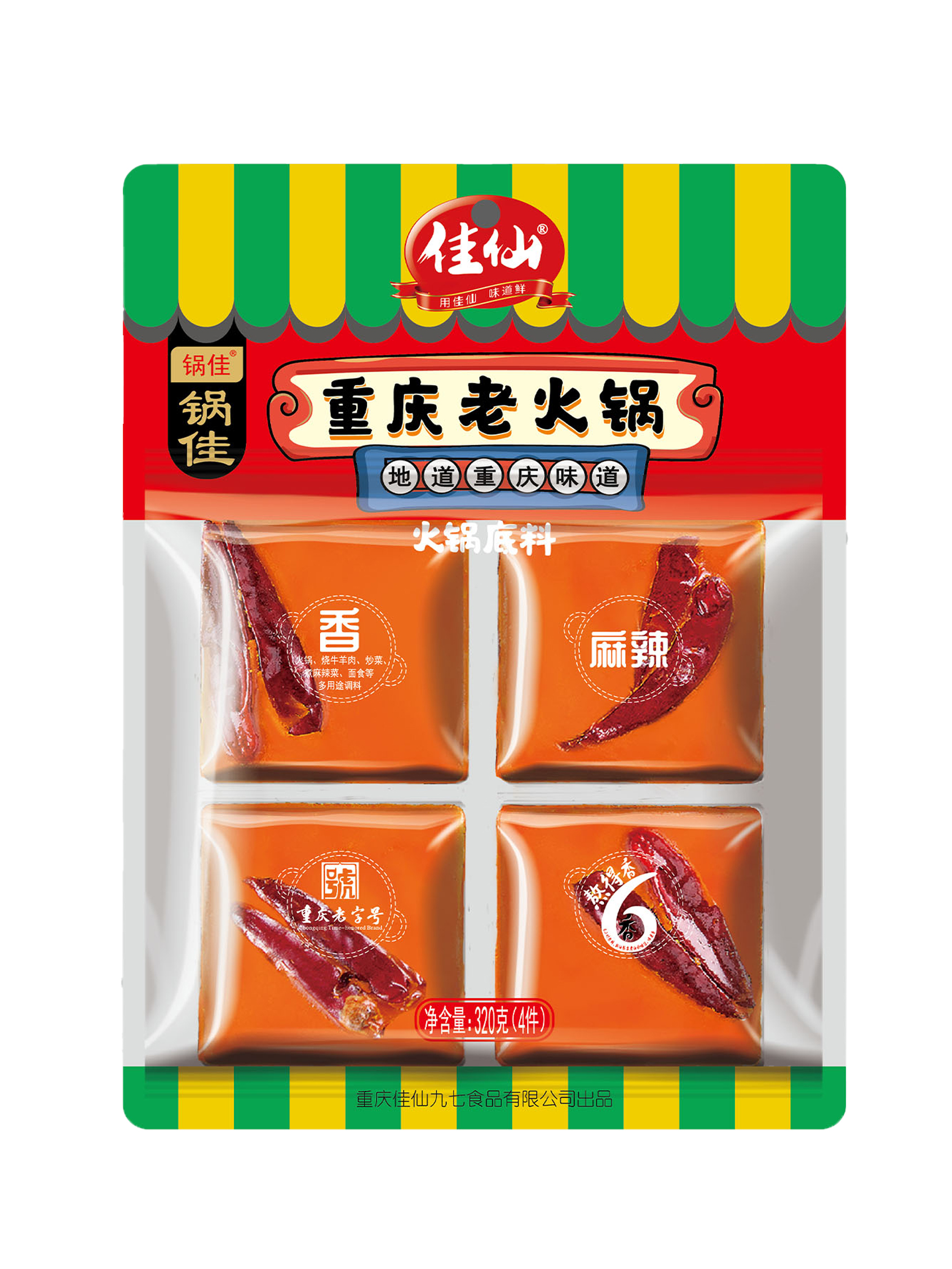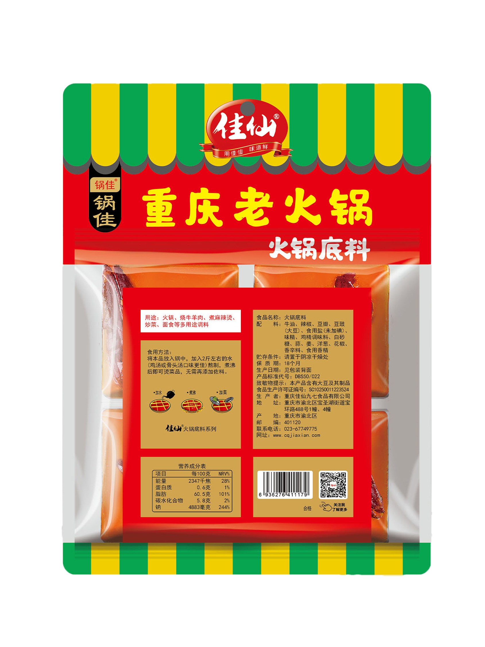 佳仙火鍋底料是重慶非物質文化遺產,它源起朝天門碼頭的老字號火鍋店,底料配方經過三代人的心手相傳延續至今。抄火鍋底料精選重慶本地產的紅辣椒、花椒、豆瓣、以及十多種香辛料,融合上等牛油,運用獨家秘方熬制6小時以上。將新油熬出了老油的口感,還原了地道的重慶味。具有辣而不燥,麻辣并重,香醇濃郁,久煮不渾,回味悠長的特點。