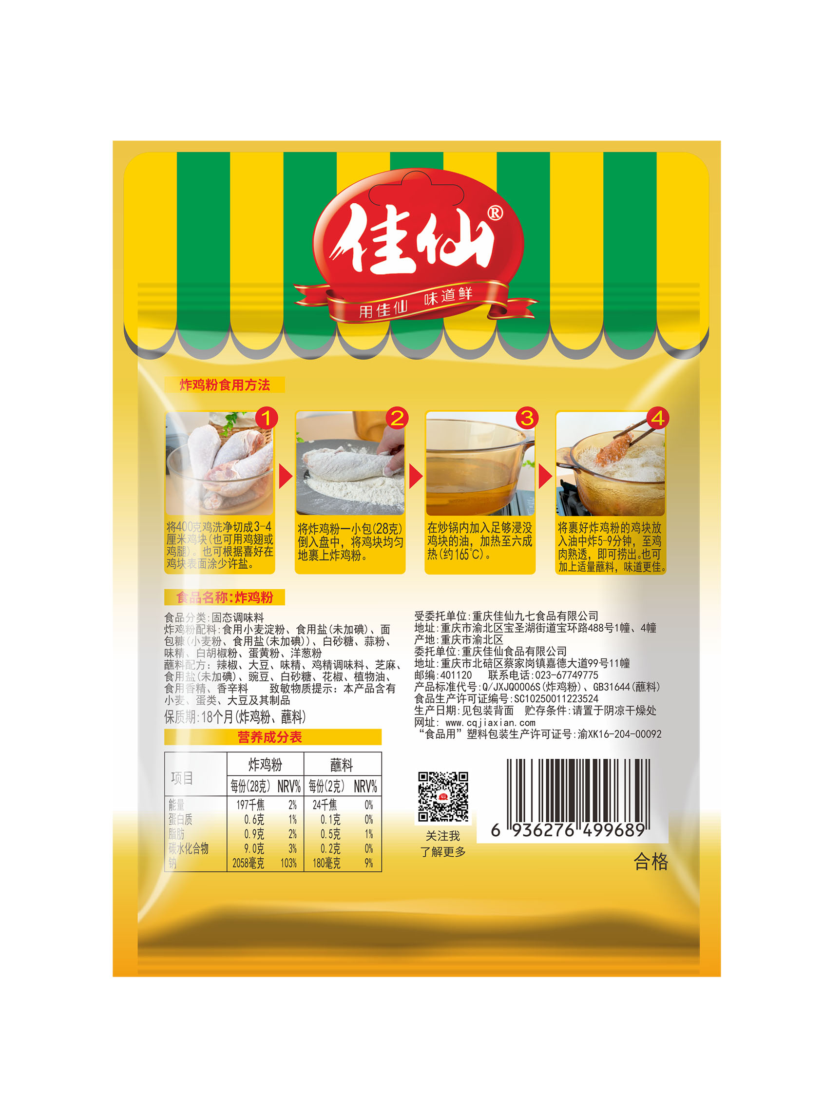 佳仙炸雞粉選自優(yōu)質小麥,悉心研磨,粉質蓬松不結塊,科學配比了一定比例的面包糠以及蒜粉、洋蔥粉、食鹽各種調味料,無需其他調味就可以用來制作炸雞、炸蝦等各種油炸美食,能夠鎖住食材的汁水,同時形成金黃酥脆的外皮。口感豐富吸油少好吃不油膩。
