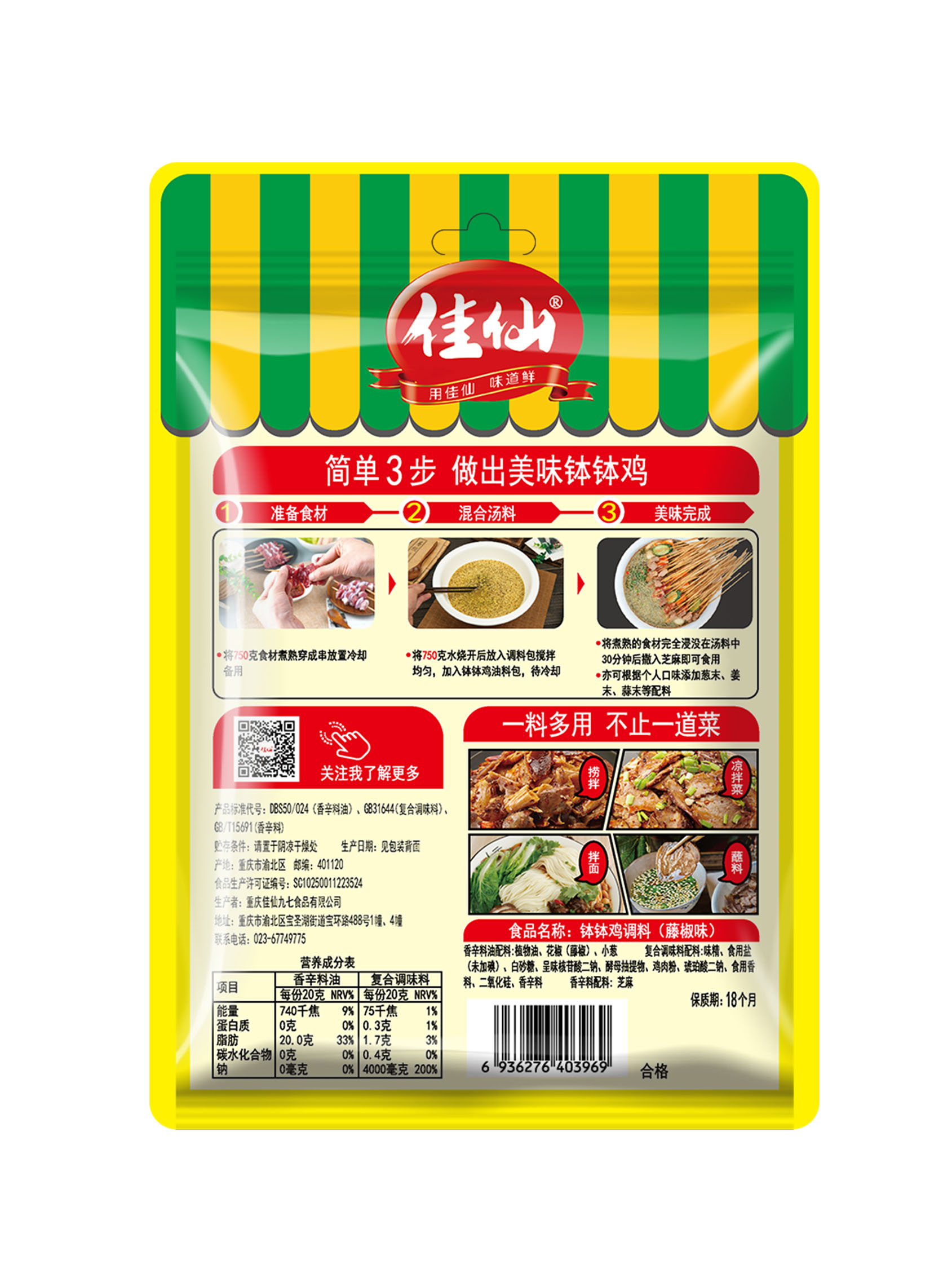 缽缽雞藤椒味200g 系列配料 產品簡介: 將樂山味道精準復刻;椒香沁人,鮮辣清香,芝麻香醇,冷熱都好吃;15分鐘快手美食,葷素食材、煮熟浸泡入味即可食用。 產品特性: 不改樂山味,冷熱都好吃,買它實現缽缽雞自由。 ? 產品簡介: 將樂山味道精準復刻;椒香沁人,鮮辣清香,芝麻香醇,冷熱都好吃;15分鐘快手美食,葷素食材、煮熟浸泡入味即可食用。 產品特性: 不改樂山味,冷熱都好吃,買它實現缽缽雞自由。 ? 淘寶商城 天貓商城 京東商城
