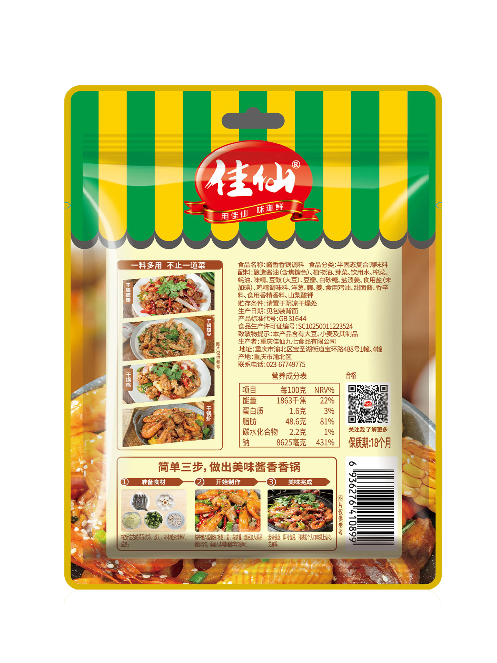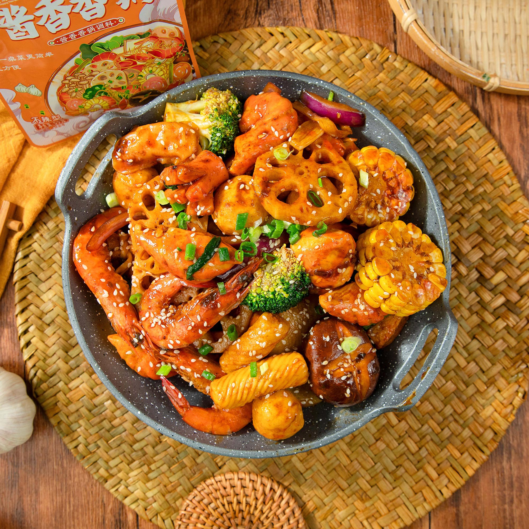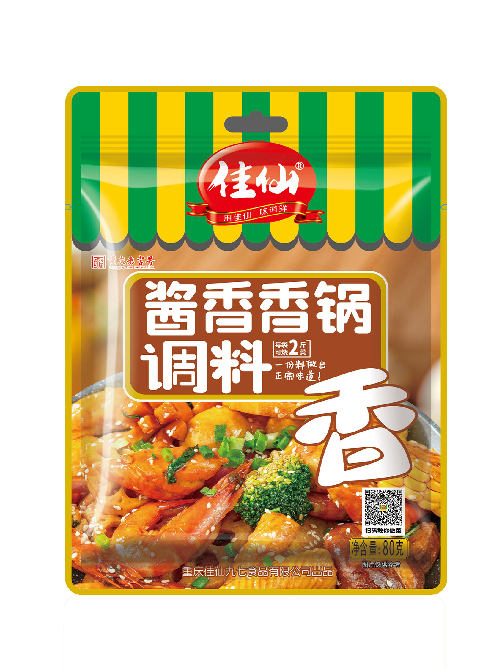 大廚秘制配方,將多種調料匠心配比,香味醇厚、醬香濃郁、料足味足,一包調料可以搭配750克葷素食材,無需高超的廚藝就能做出媲美餐廳味道的醬香香鍋。