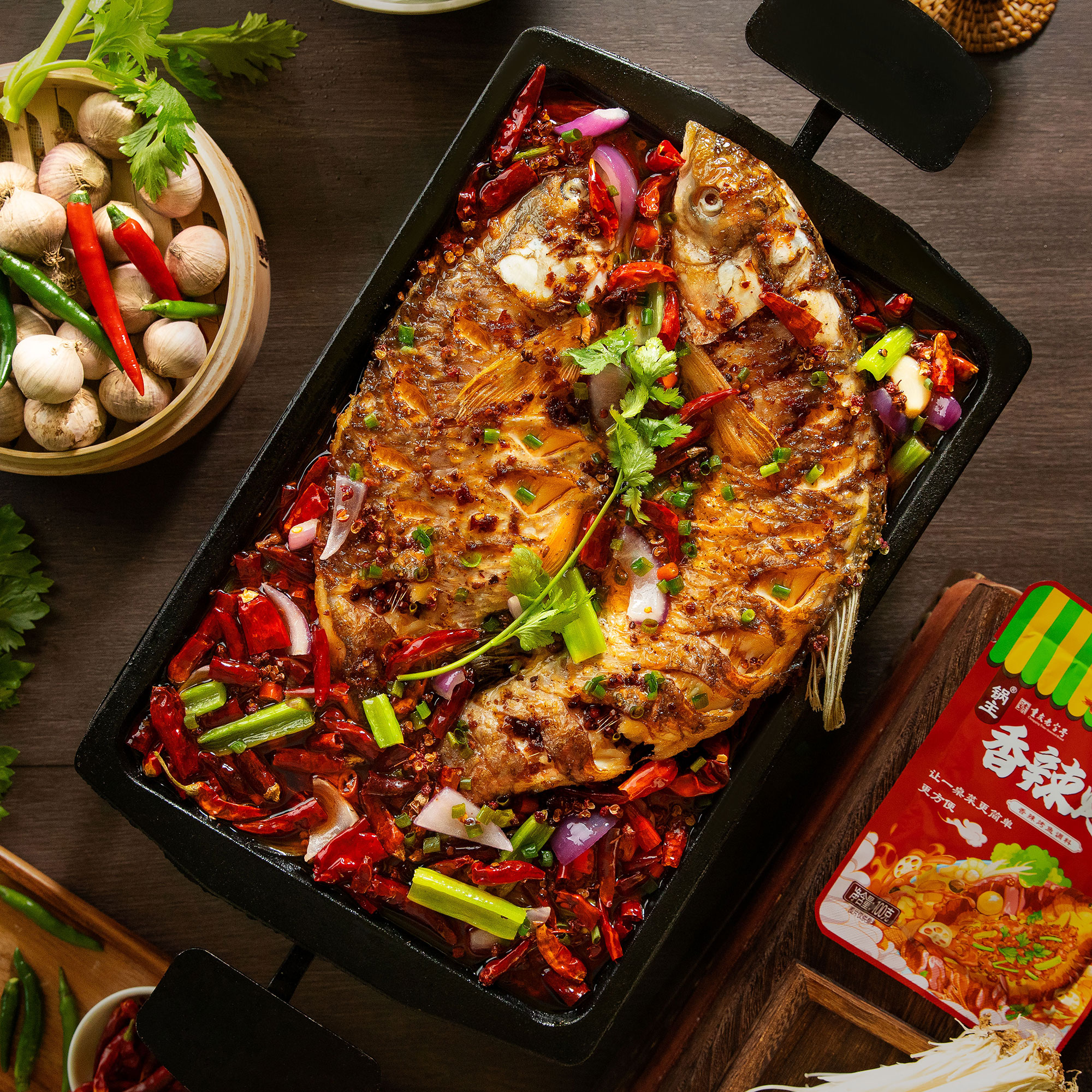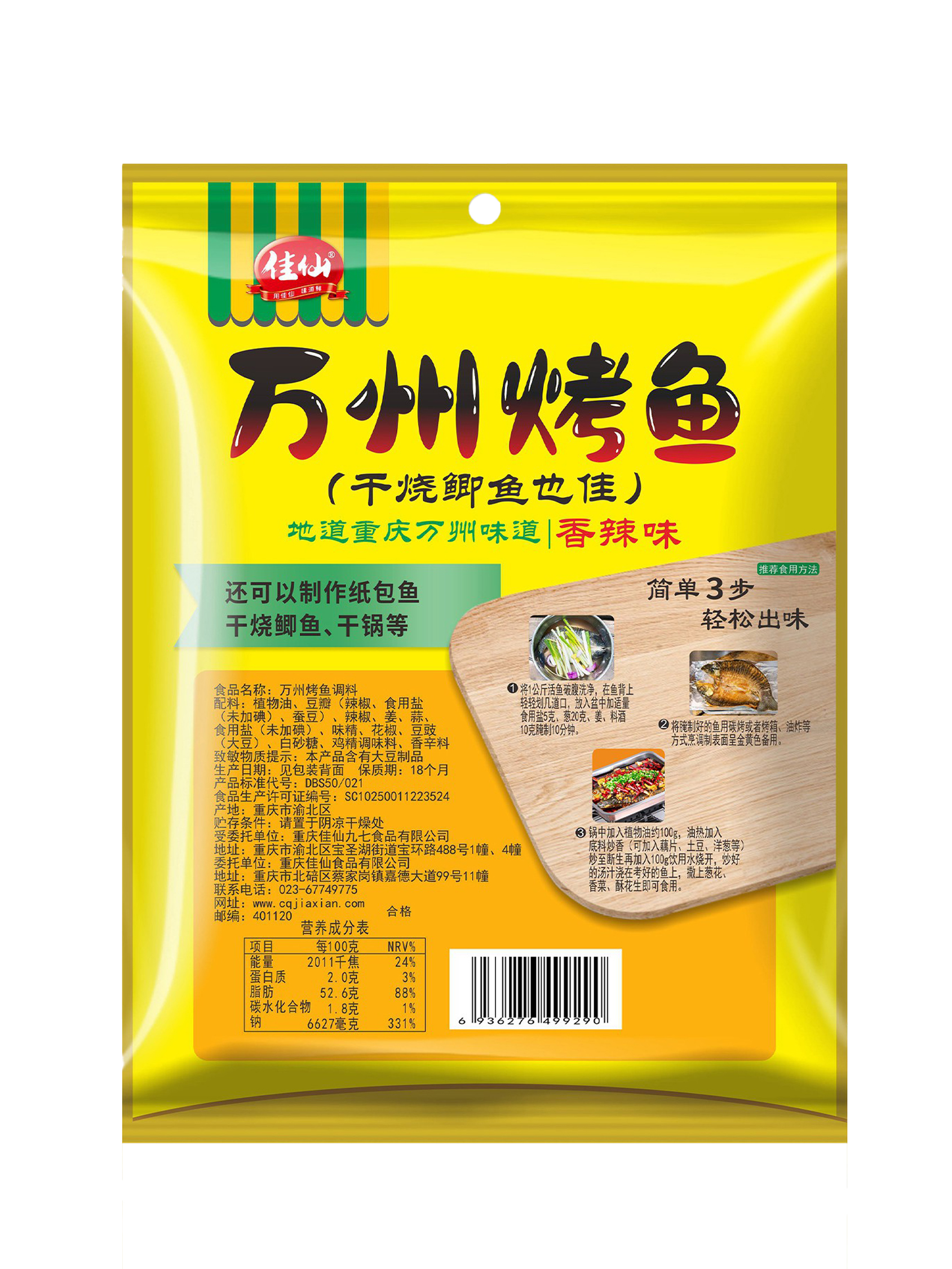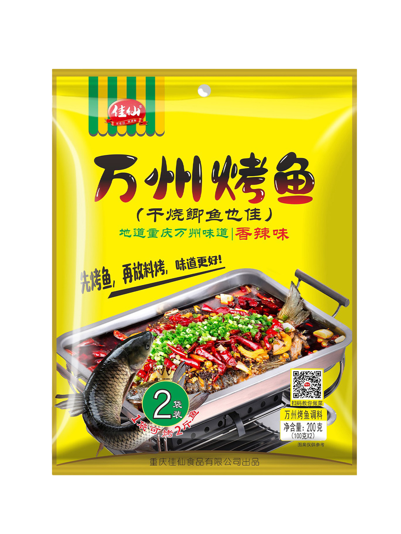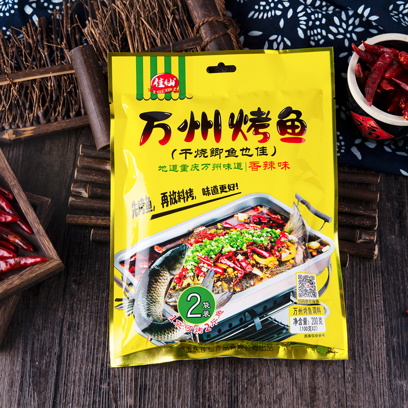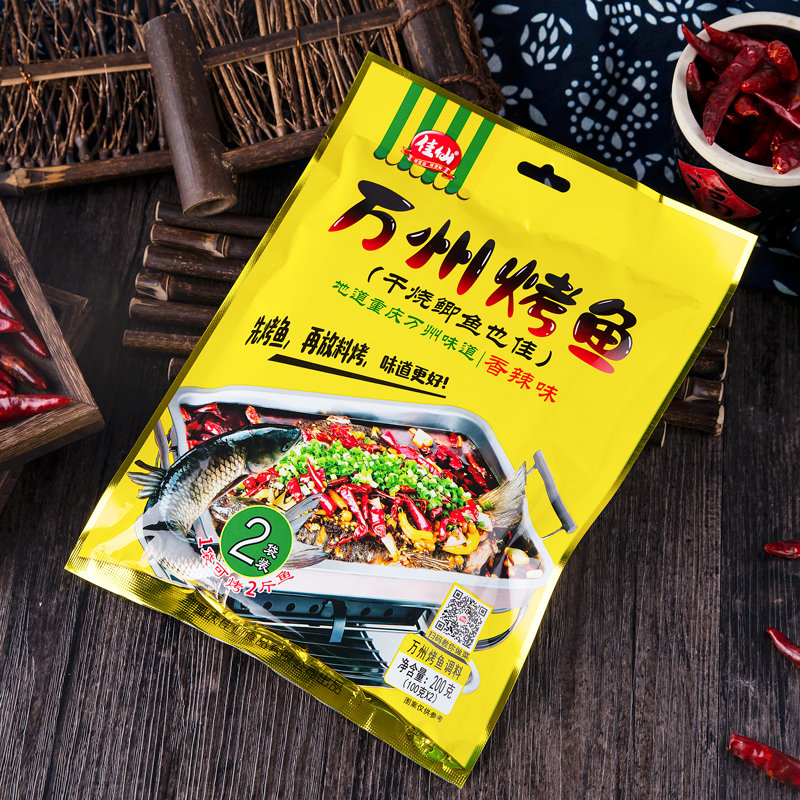 佳仙萬州烤魚調料多種香料煉制而成,醇香味足,熱辣四溢;一袋可烤兩斤魚,在家也能做正宗萬州烤魚。
