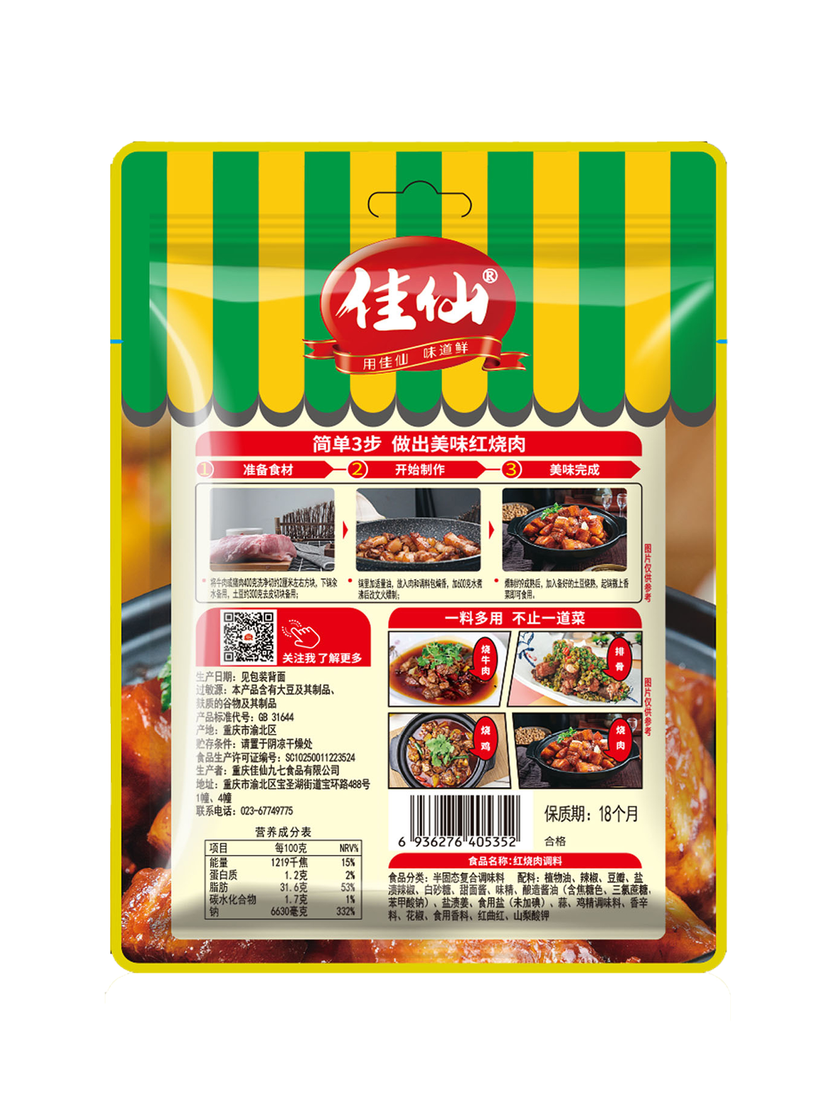 佳仙紅燒肉調(diào)料甄選多種優(yōu)質(zhì)原料,大廚秘制配方,味道正宗;軟糯香滑,濃香入味;簡單便捷,一包料做出正宗味道,還原餐廳堂食級(jí)風(fēng)味。