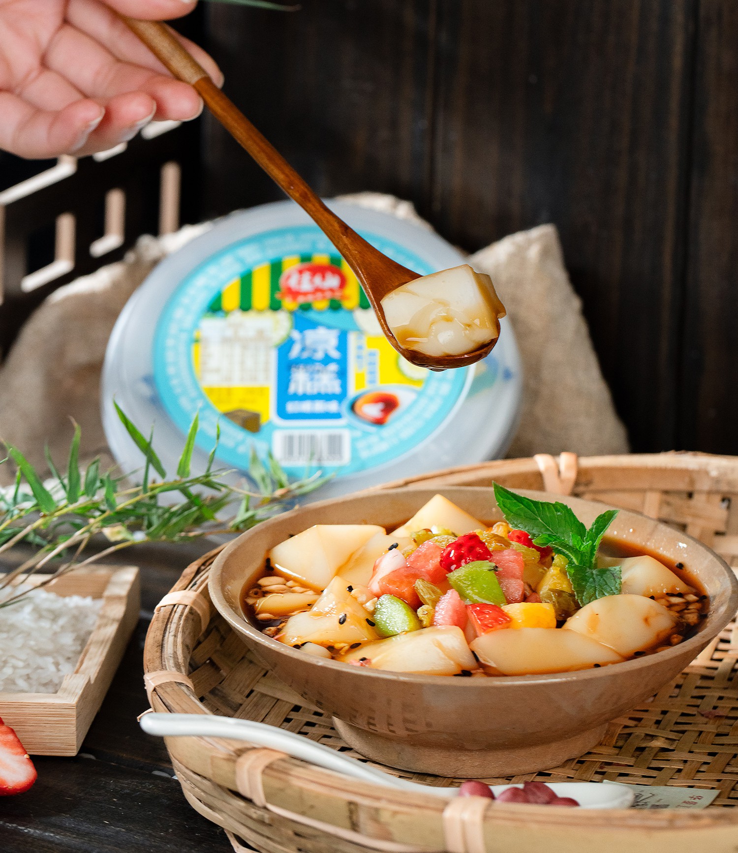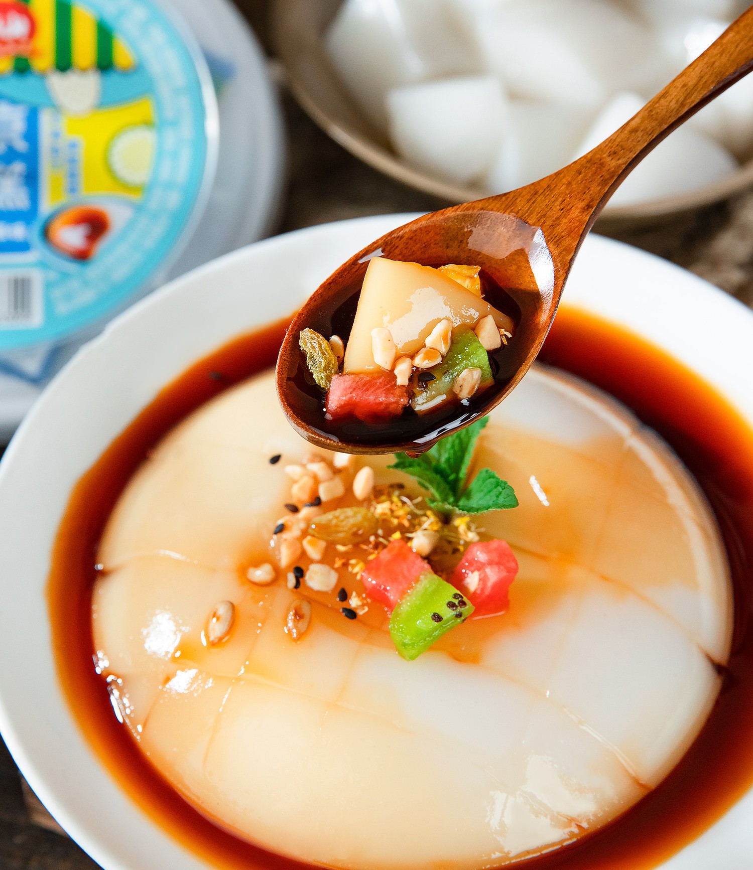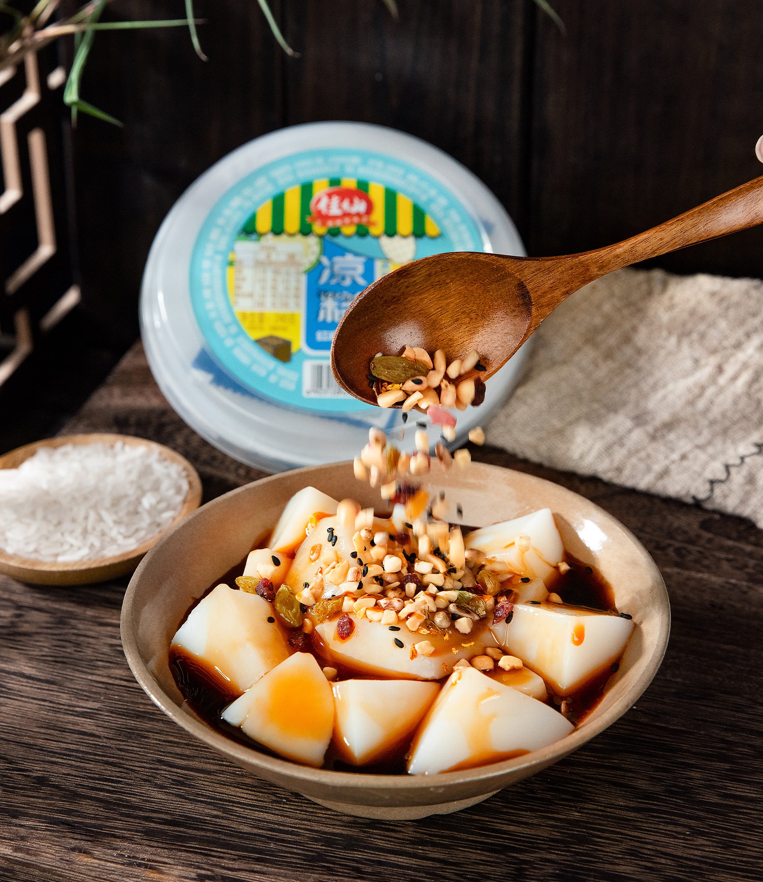 打開涼糕包裝蓋,撕開封口膜,倒入紅糖漿即可食用,放進冰箱冷藏口感更佳。