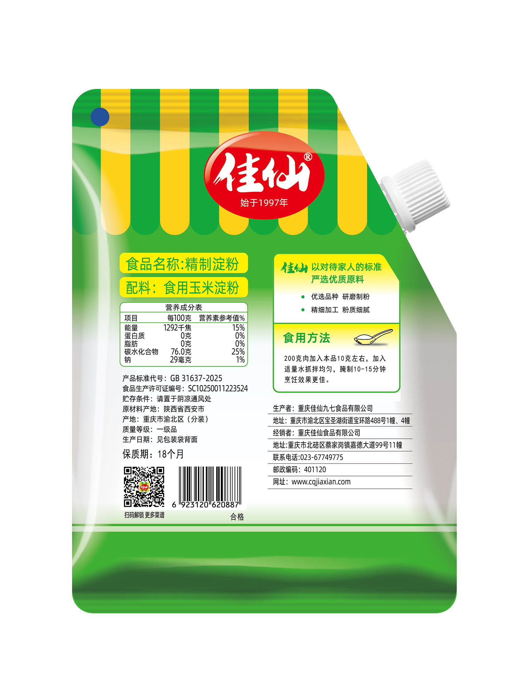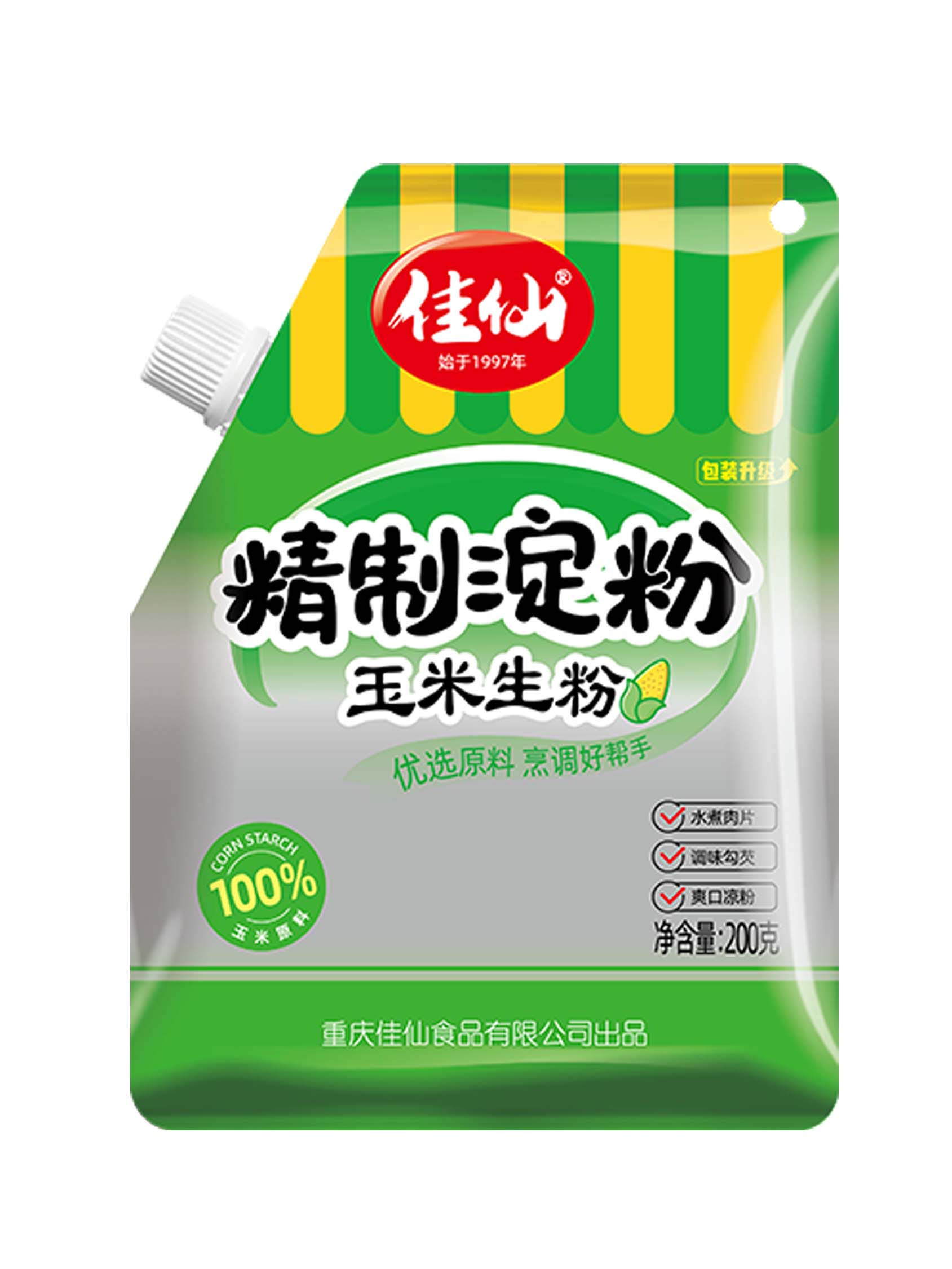 佳仙精制淀粉嚴選優質玉米。歷經多重研磨工序制成 ,精細加工口感更好,易溶解不結塊,用于嫩肉可以讓肉保持嫩滑口感,用于勾芡黏性好,可以增加菜品湯汁的粘稠度,用途多樣。