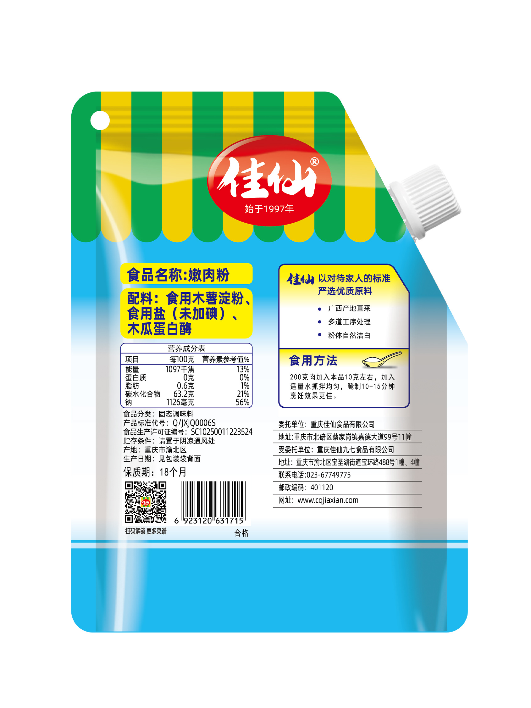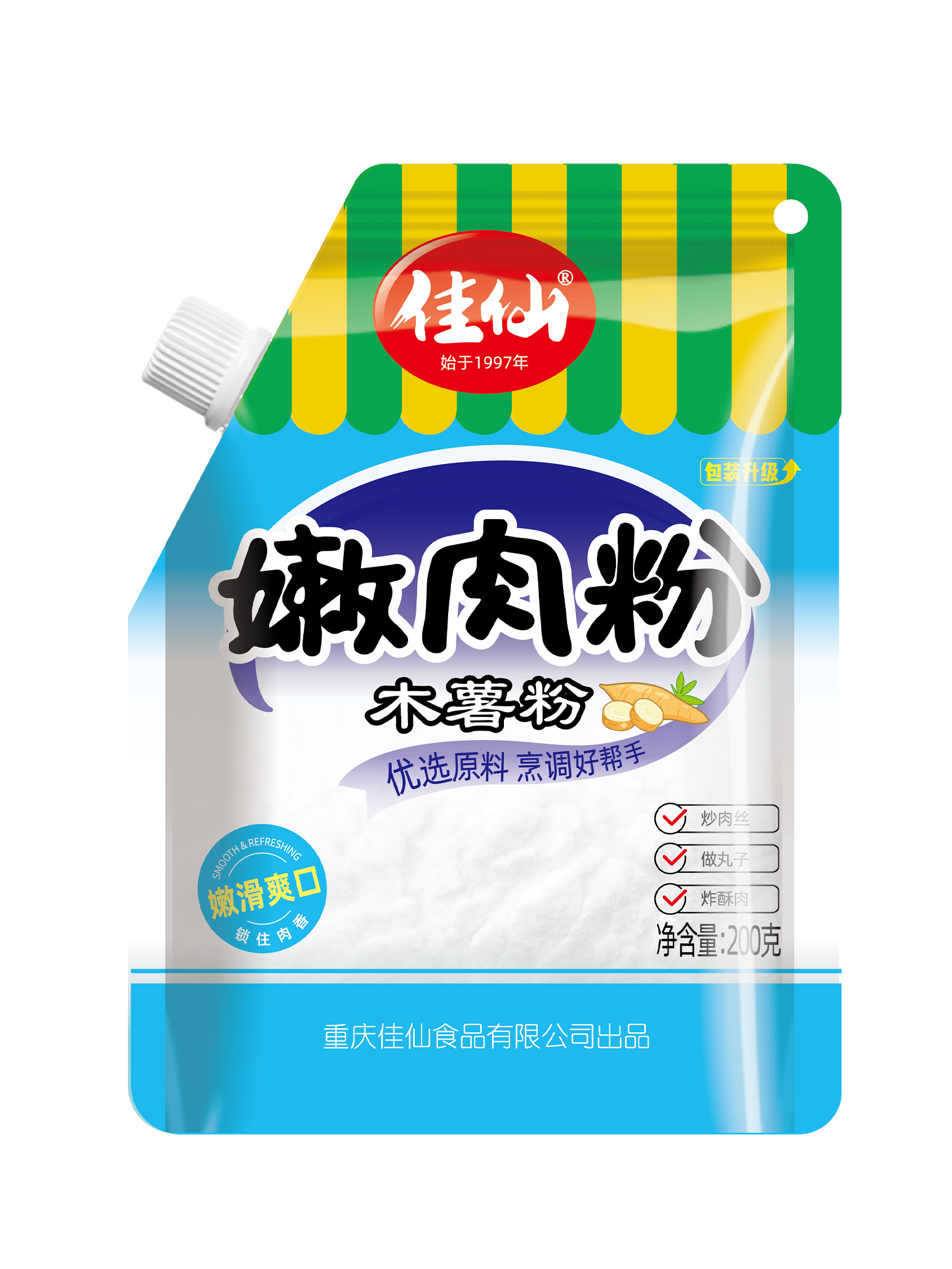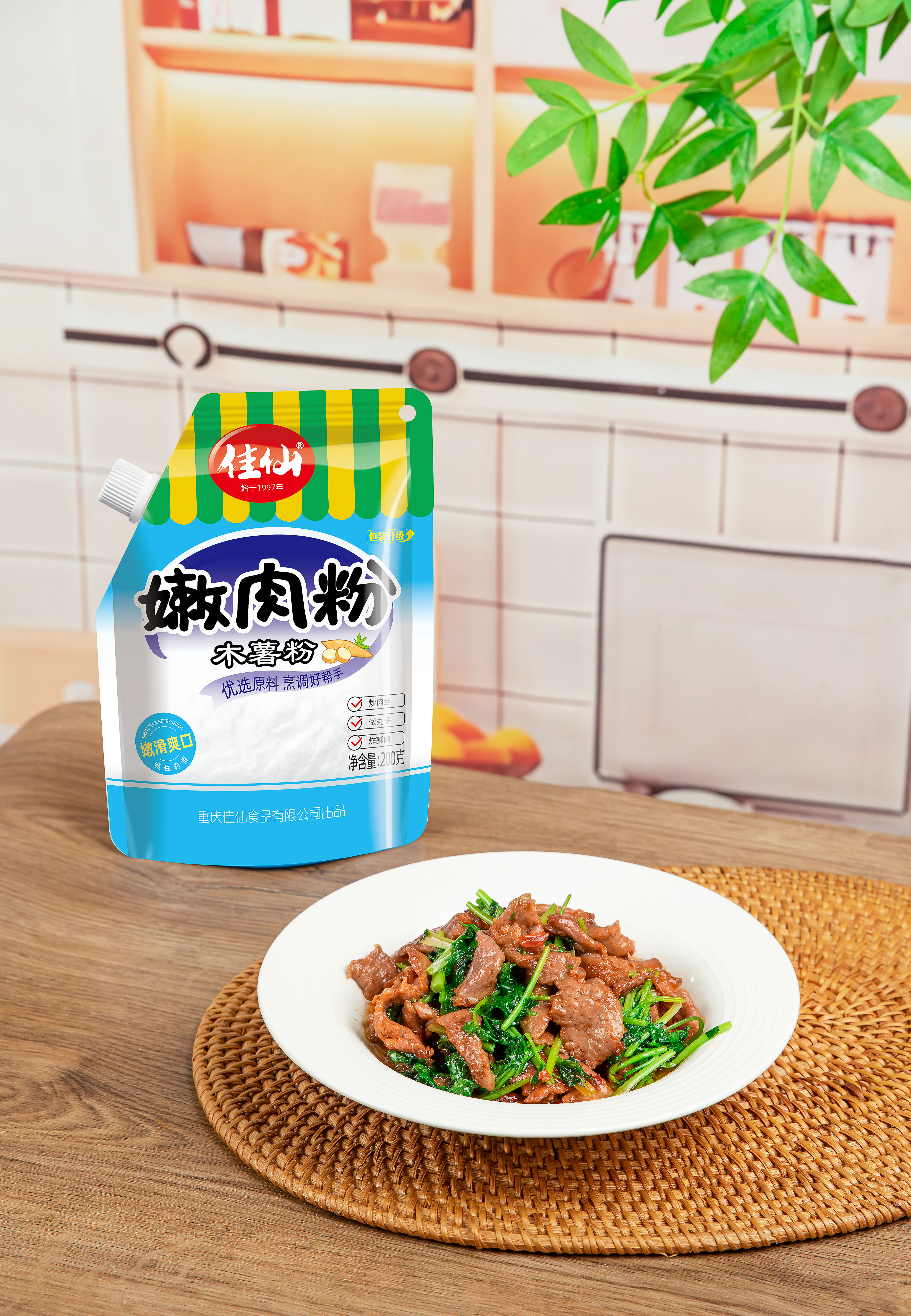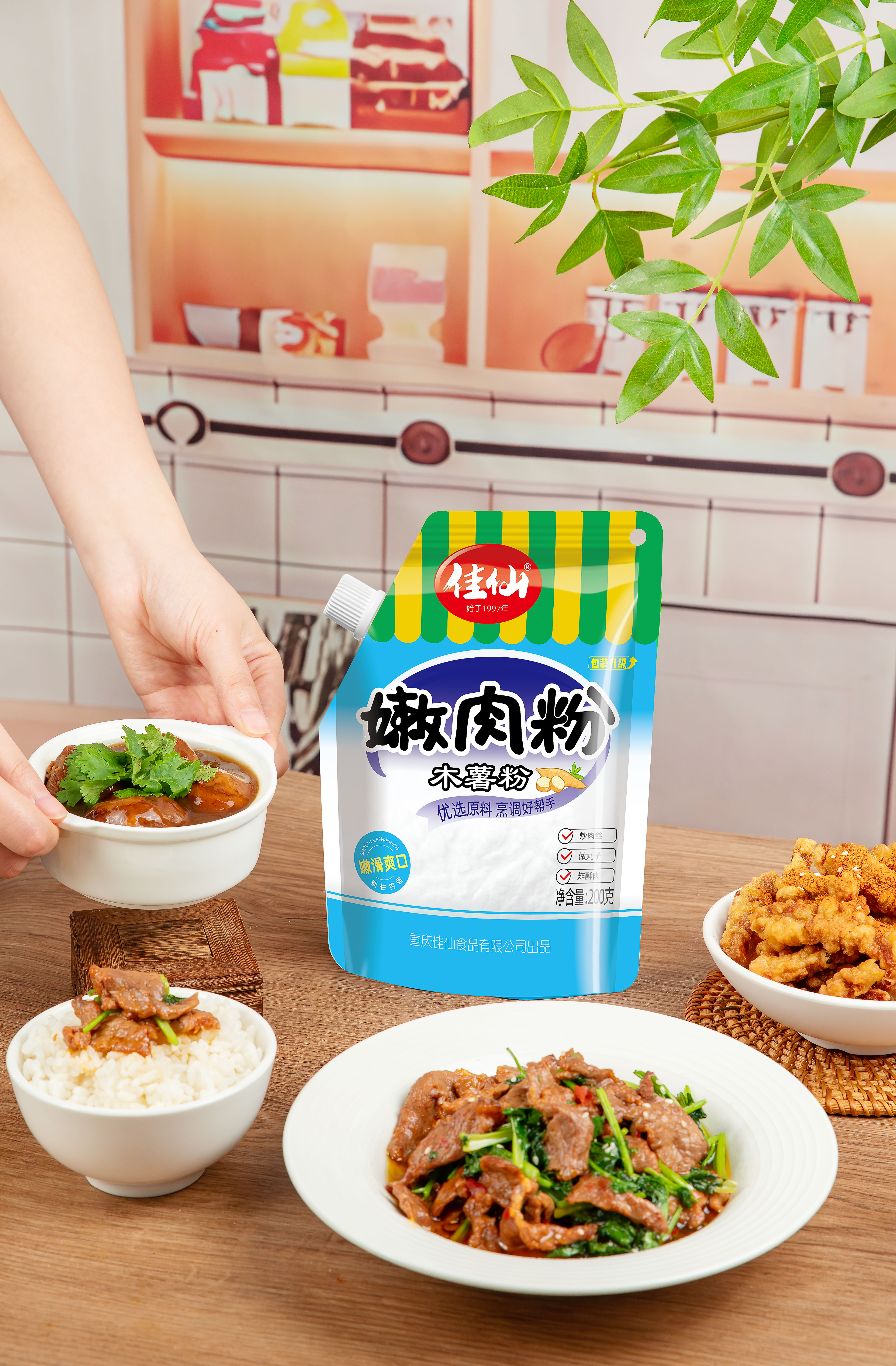 佳仙嫩肉粉可以軟化肉質,讓肉類食材變得柔軟多汁,鮮嫩可口。縮短肉類的烹飪時長,讓肉保持水份,提升色、香、味的同時更易咀嚼,方便老人小孩食用。