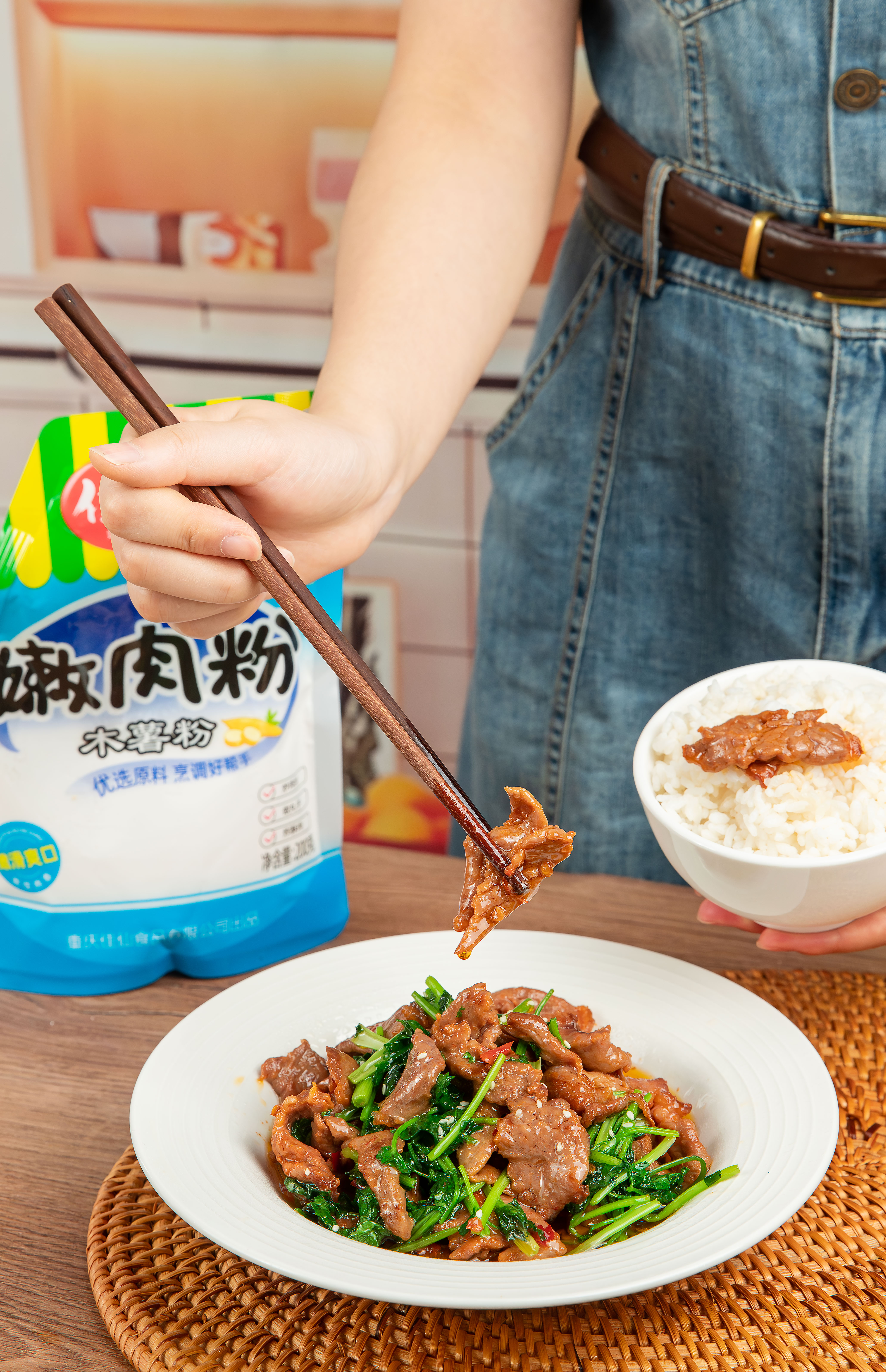 每250-500克肉適用本品1-2滿匙,于烹飪前5分鐘加水攪拌,和肉拌勻,即可下鍋。