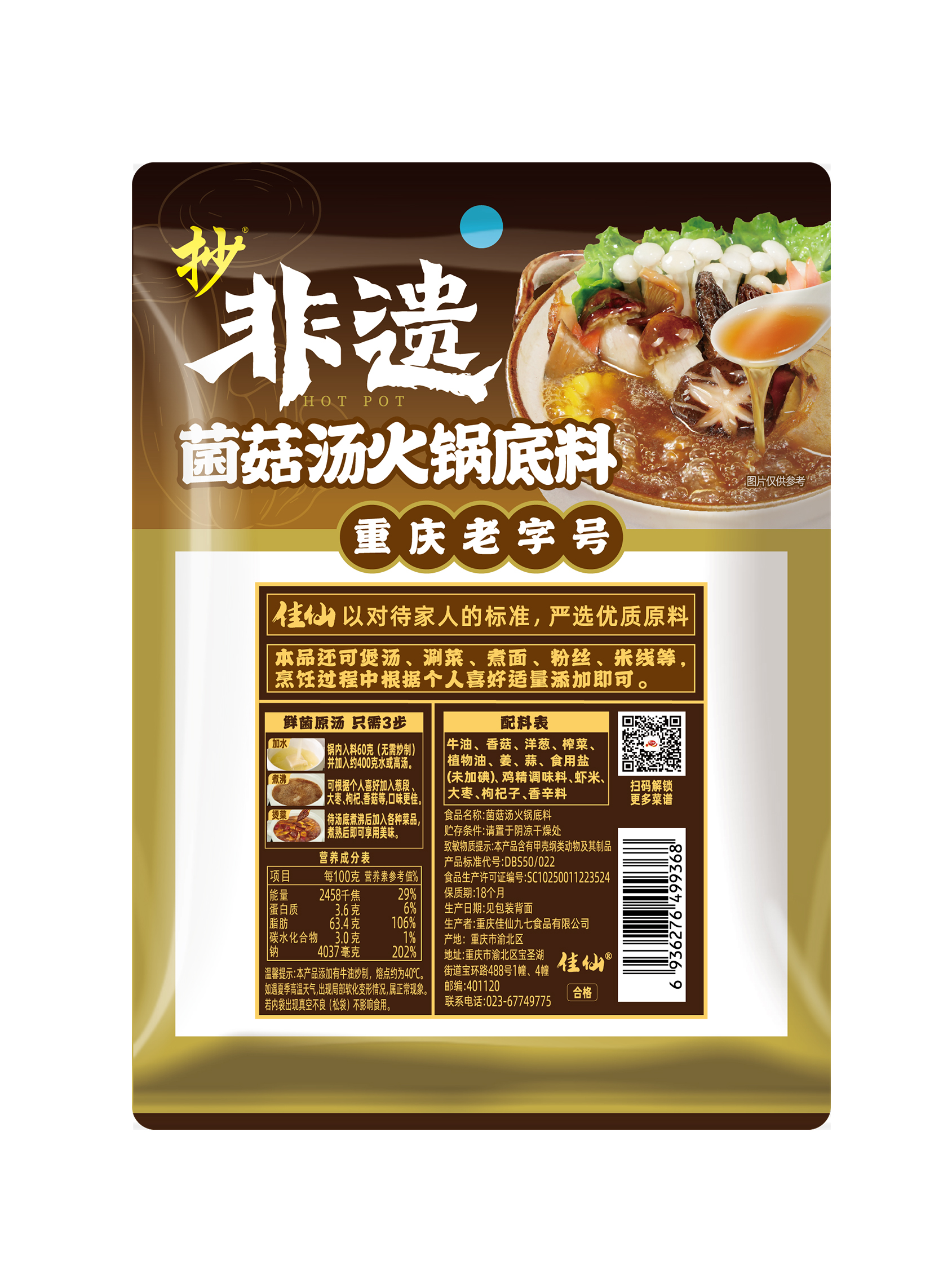 抄菌湯底料采用優質菌菇慢火熬制6小時以上,鎖住營養,加倍鮮美,清香不膩,口口甘醇,只需加水熬煮,就能得到一鍋好喝的菌菇高湯,既能涮煮火鍋,又能用來煲湯、煮湯菜、煮面食、是老少皆宜,適合全家共享的健康火鍋底料。