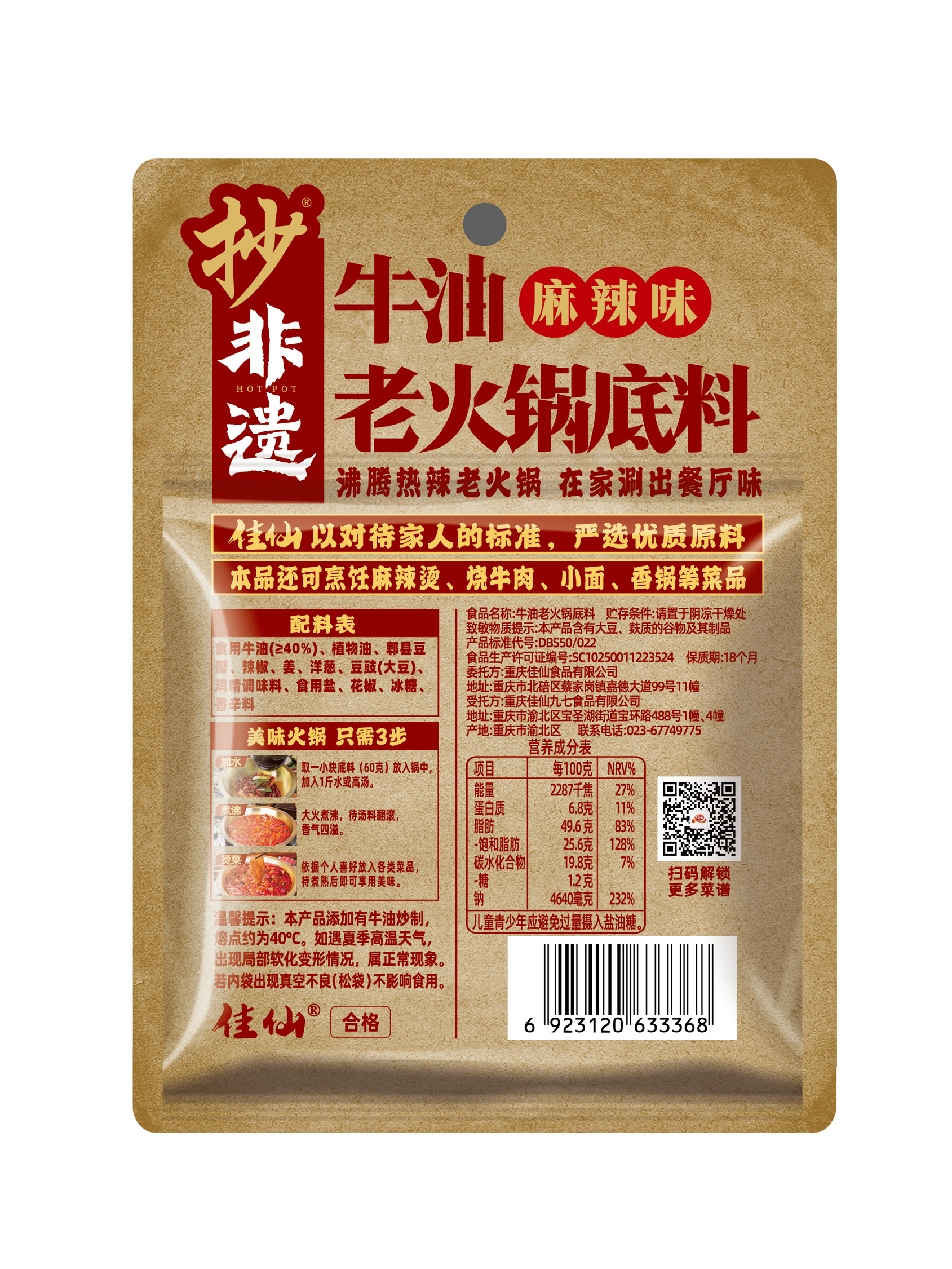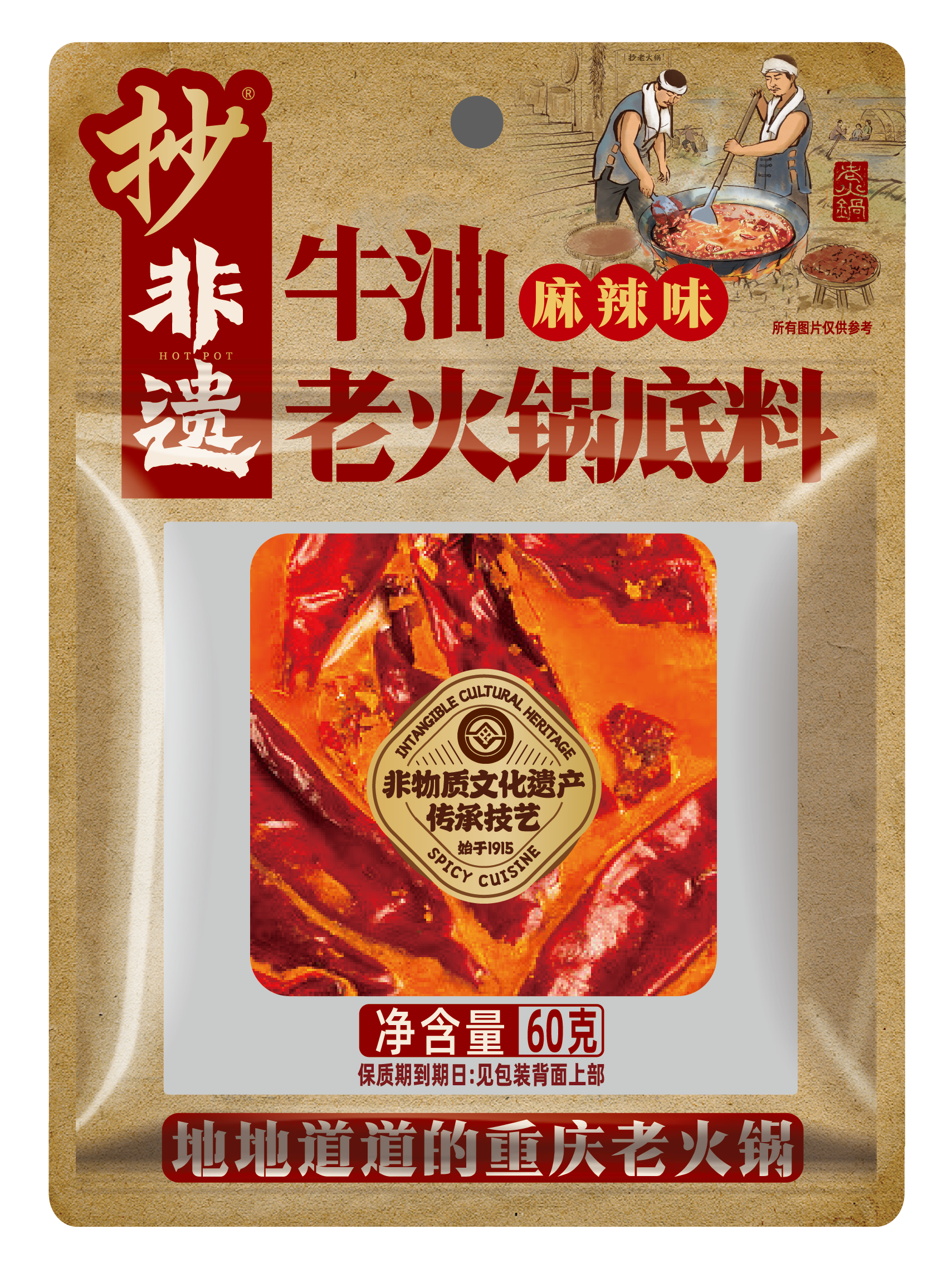 抄火鍋底料是重慶非物質文化遺產,它源起朝天門碼頭的老字號火鍋店,底料配方經過三代人的心手相傳延續至今。抄火鍋底料精選重慶本地產的紅辣椒、花椒、豆瓣、以及十多種香辛料,融合上等牛油,運用獨家秘方熬制6小時以上。將新油熬出了老油的口感,還原了地道的重慶味。具有辣而不燥,麻辣并重,香醇濃郁,久煮不渾,回味悠長的特點。