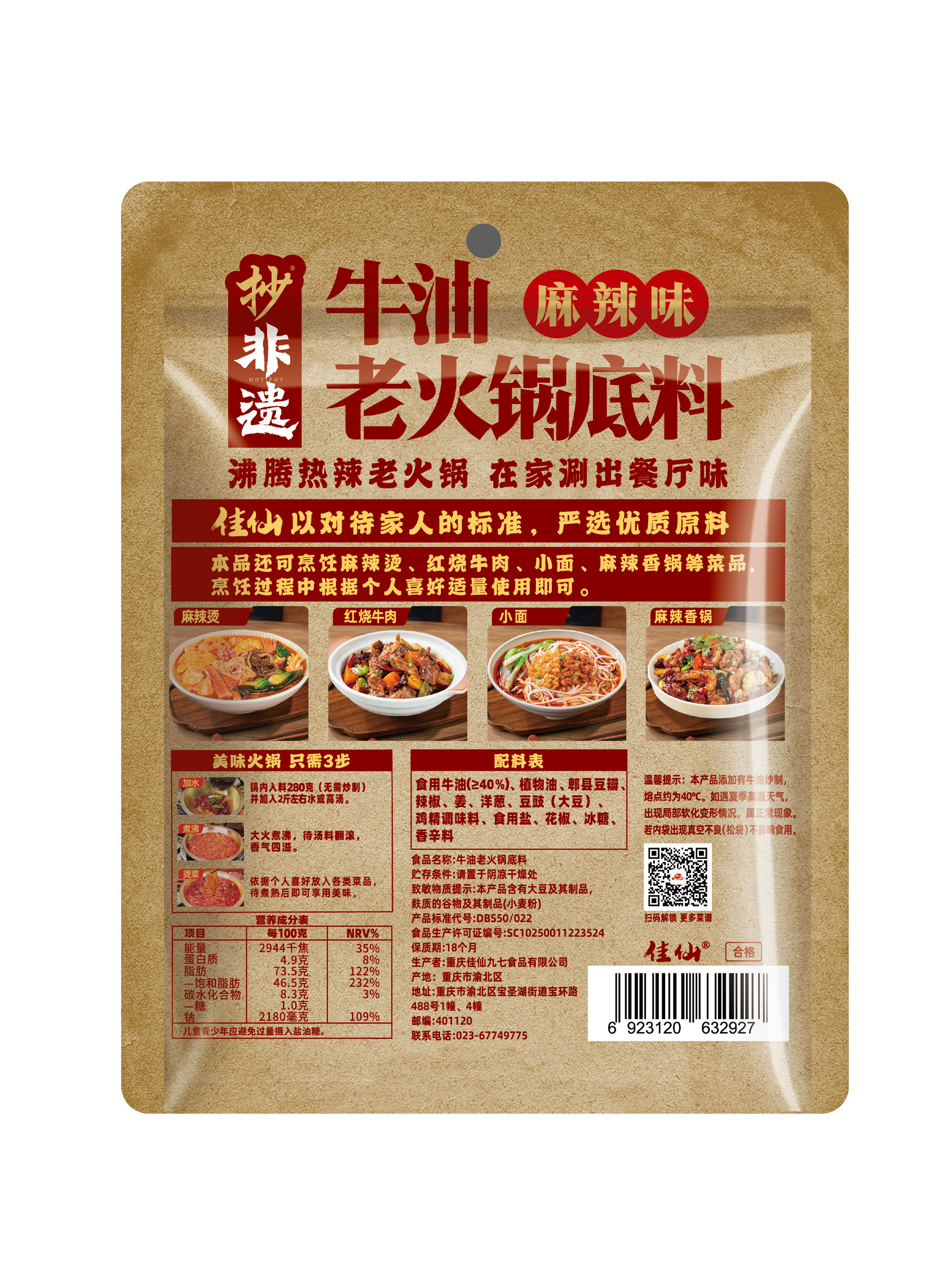抄火鍋底料是重慶非物質文化遺產,它源起朝天門碼頭的老字號火鍋店,底料配方經過三代人的心手相傳延續至今。抄火鍋底料精選重慶本地產的紅辣椒、花椒、豆瓣、以及十多種香辛料,融合上等牛油,運用獨家秘方熬制6小時以上。將新油熬出了老油的口感,還原了地道的重慶味。具有辣而不燥,麻辣并重,香醇濃郁,久煮不渾,回味悠長的特點。