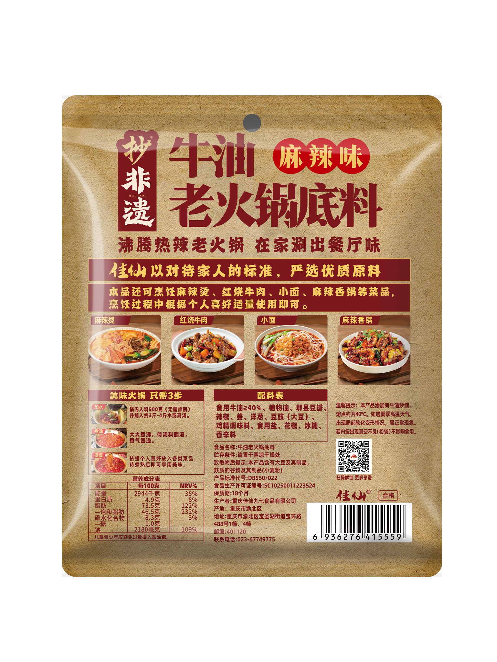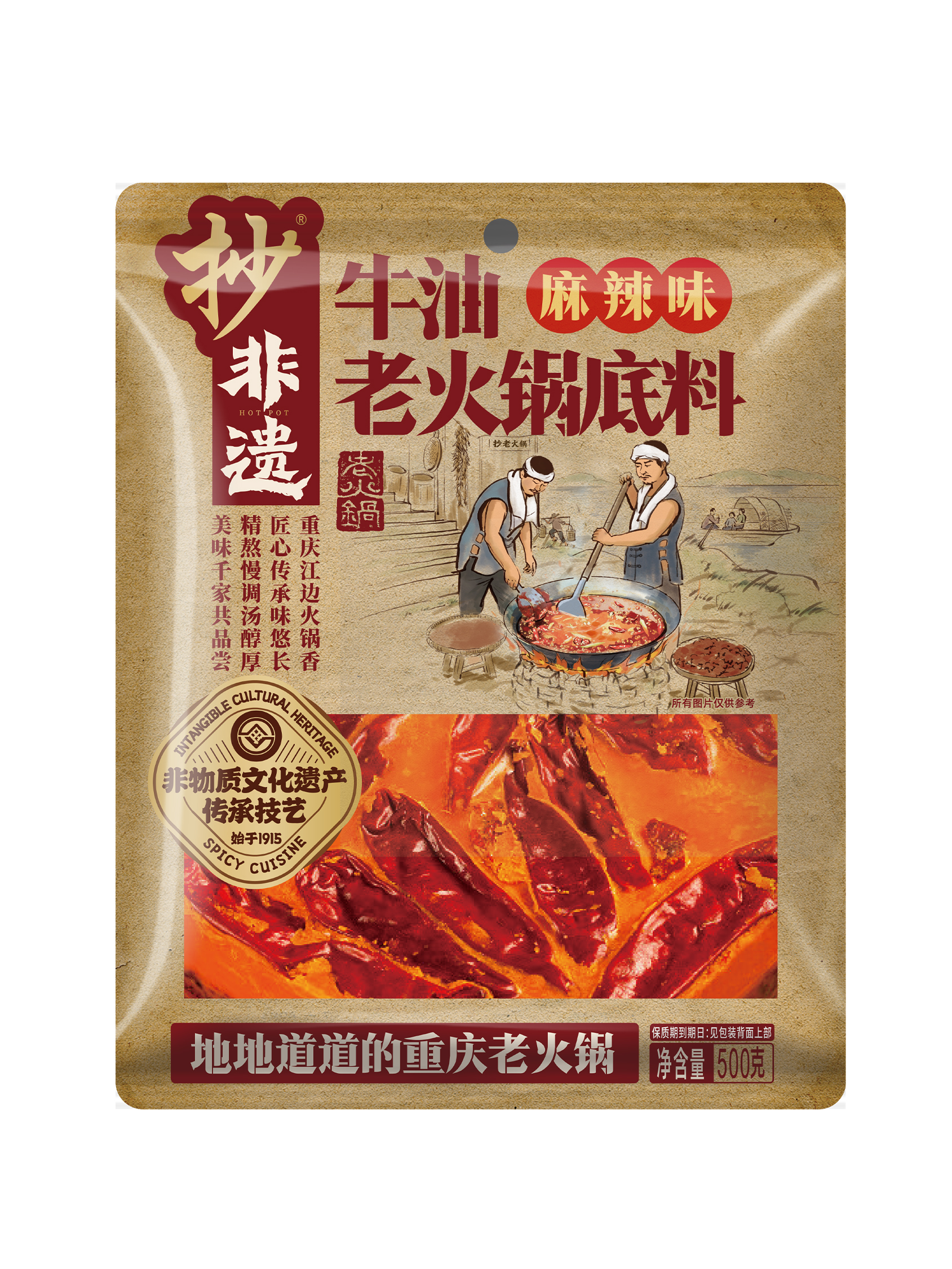 抄火鍋底料是重慶非物質文化遺產,它源起朝天門碼頭的老字號火鍋店,底料配方經過三代人的心手相傳延續至今。抄火鍋底料精選重慶本地產的紅辣椒、花椒、豆瓣、以及十多種香辛料,融合上等牛油,運用獨家秘方熬制6小時以上。將新油熬出了老油的口感,還原了地道的重慶味。具有辣而不燥,麻辣并重,香醇濃郁,久煮不渾,回味悠長的特點。