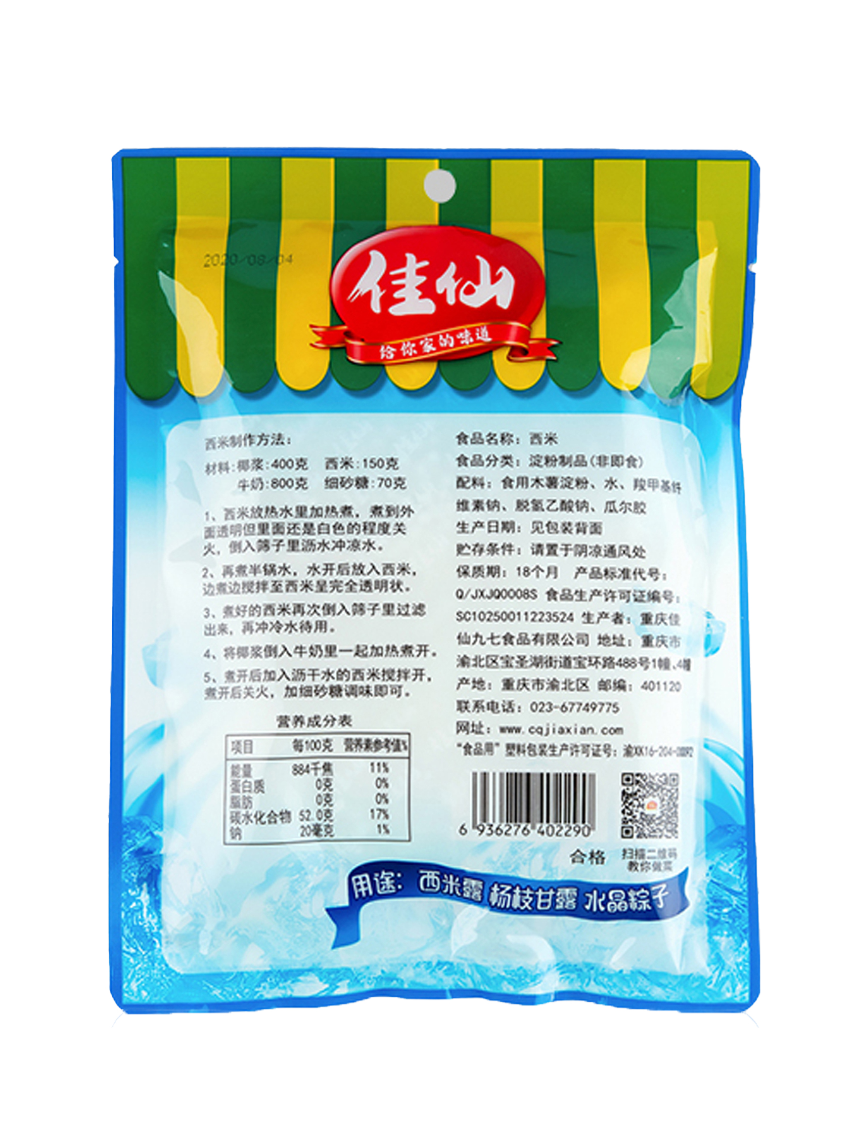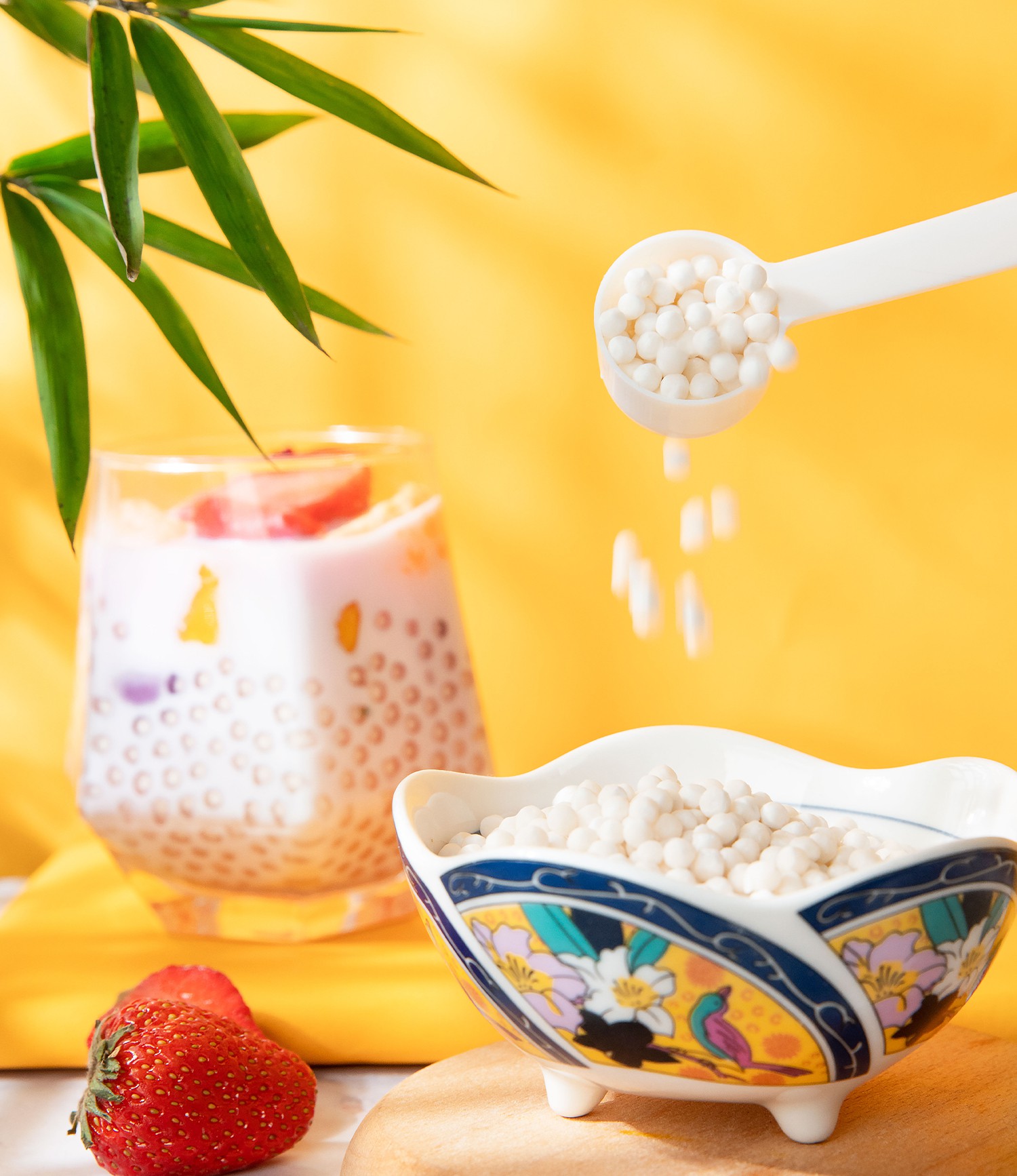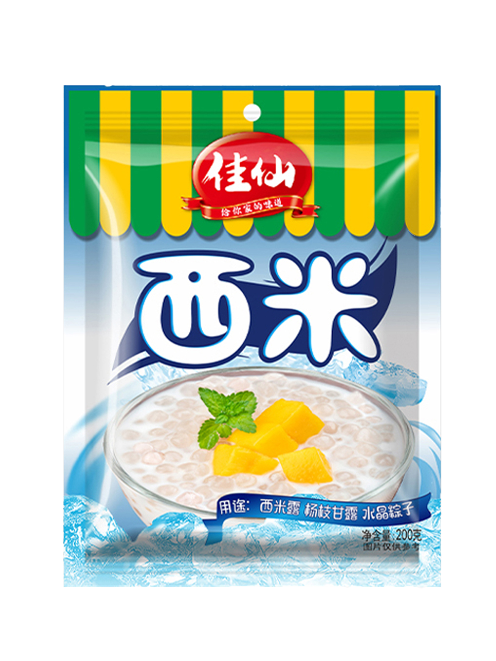 佳仙西米由木薯淀粉為主原料制作而成,色澤白皙,光滑均勻,圓潤飽滿,久煮不糊。用水煮熟后適用于各種甜品飲品。