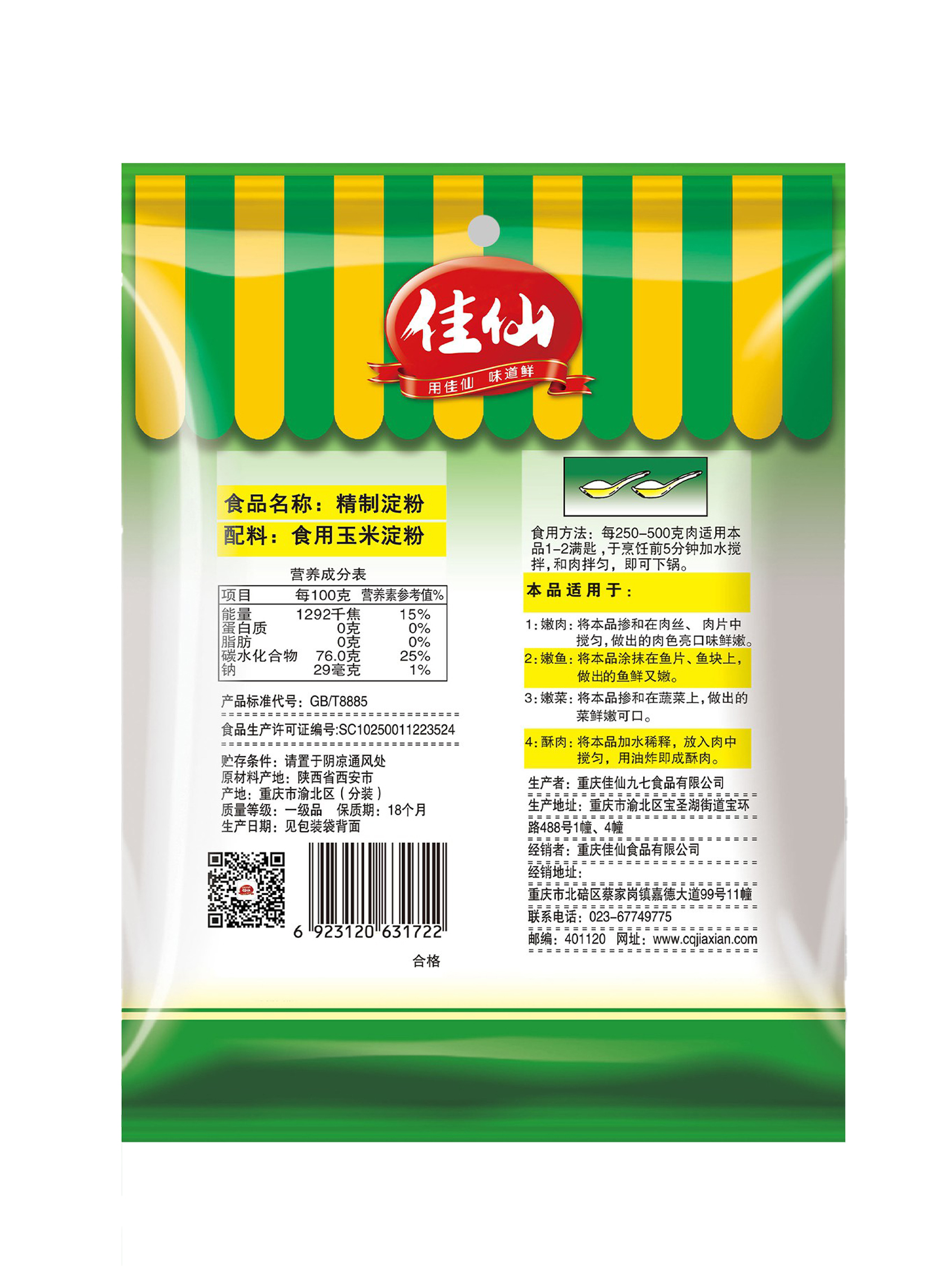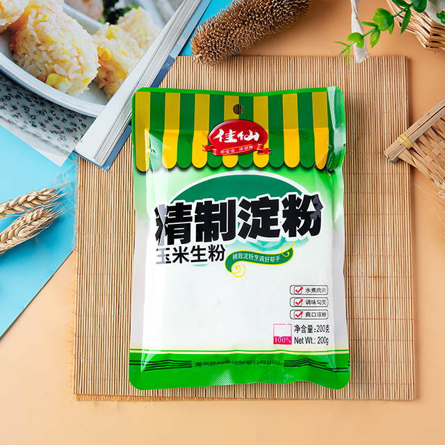 佳仙精制淀粉嚴選優質玉米。歷經多重研磨工序制成 ,精細加工口感更好,易溶解不結塊,用于嫩肉可以讓肉保持嫩滑口感,用于勾芡黏性好,可以增加菜品湯汁的粘稠度,用途多樣。
