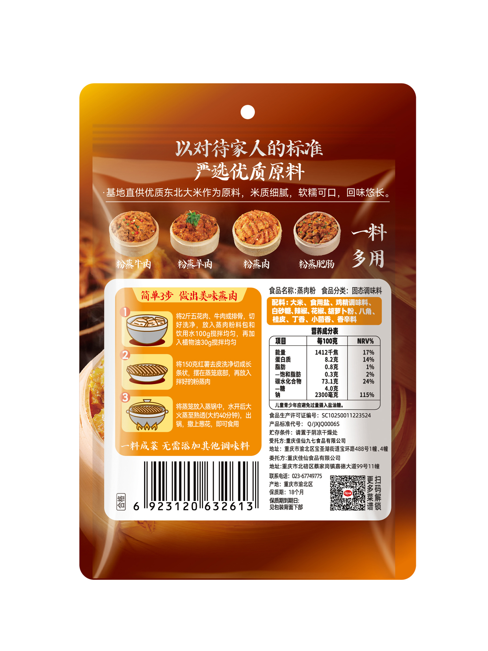 選取優質大米、多種香辛料精心配比制成蒸肉粉,香濃可口,嫩而不糜、操作簡單,一袋可蒸兩斤肉,性價比很高,可以用來制作粉蒸肉,粉蒸牛肉,粉蒸排骨等等美食,麻辣、五香、香辣三種不同口味同樣美味,足不出戶就能吃到餐廳的味道。