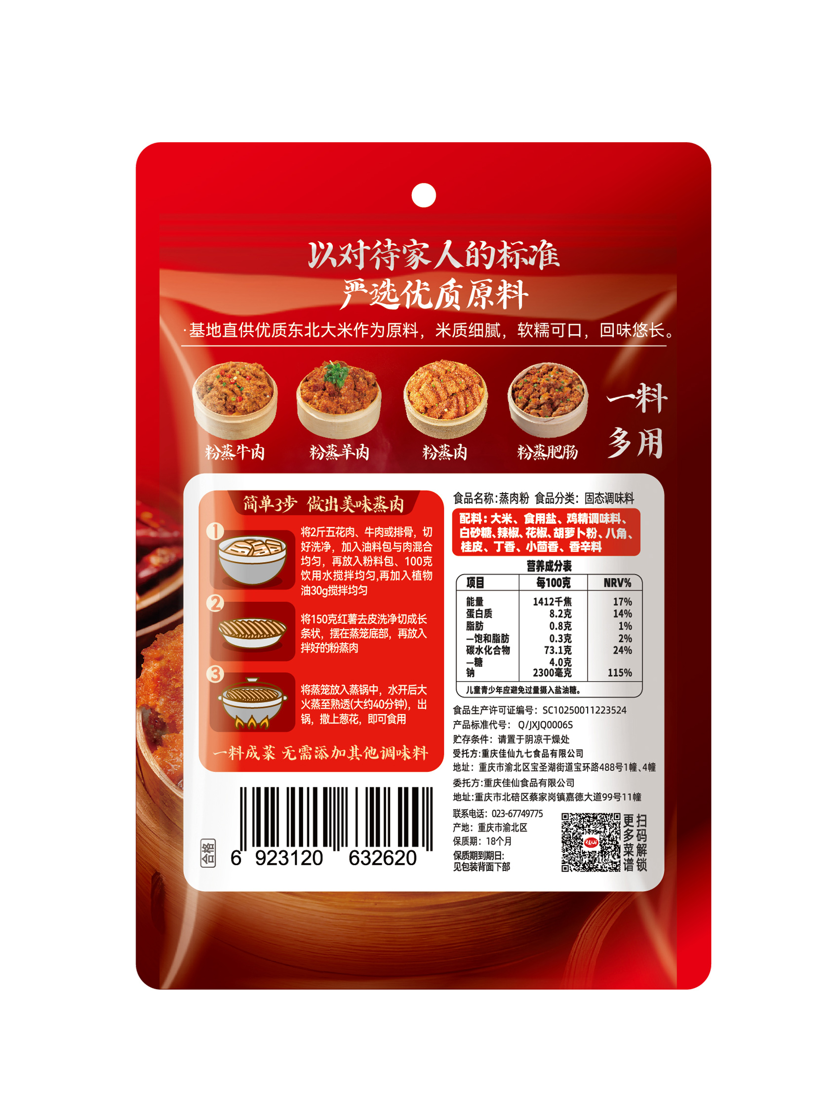 選取優(yōu)質(zhì)大米、多種香辛料精心配比制成蒸肉粉,香濃可口,嫩而不糜、操作簡單,一袋可蒸兩斤肉,性價比很高,可以用來制作粉蒸肉,粉蒸牛肉,粉蒸排骨等等美食,麻辣、五香、香辣三種不同口味同樣美味,足不出戶就能吃到餐廳的味道。