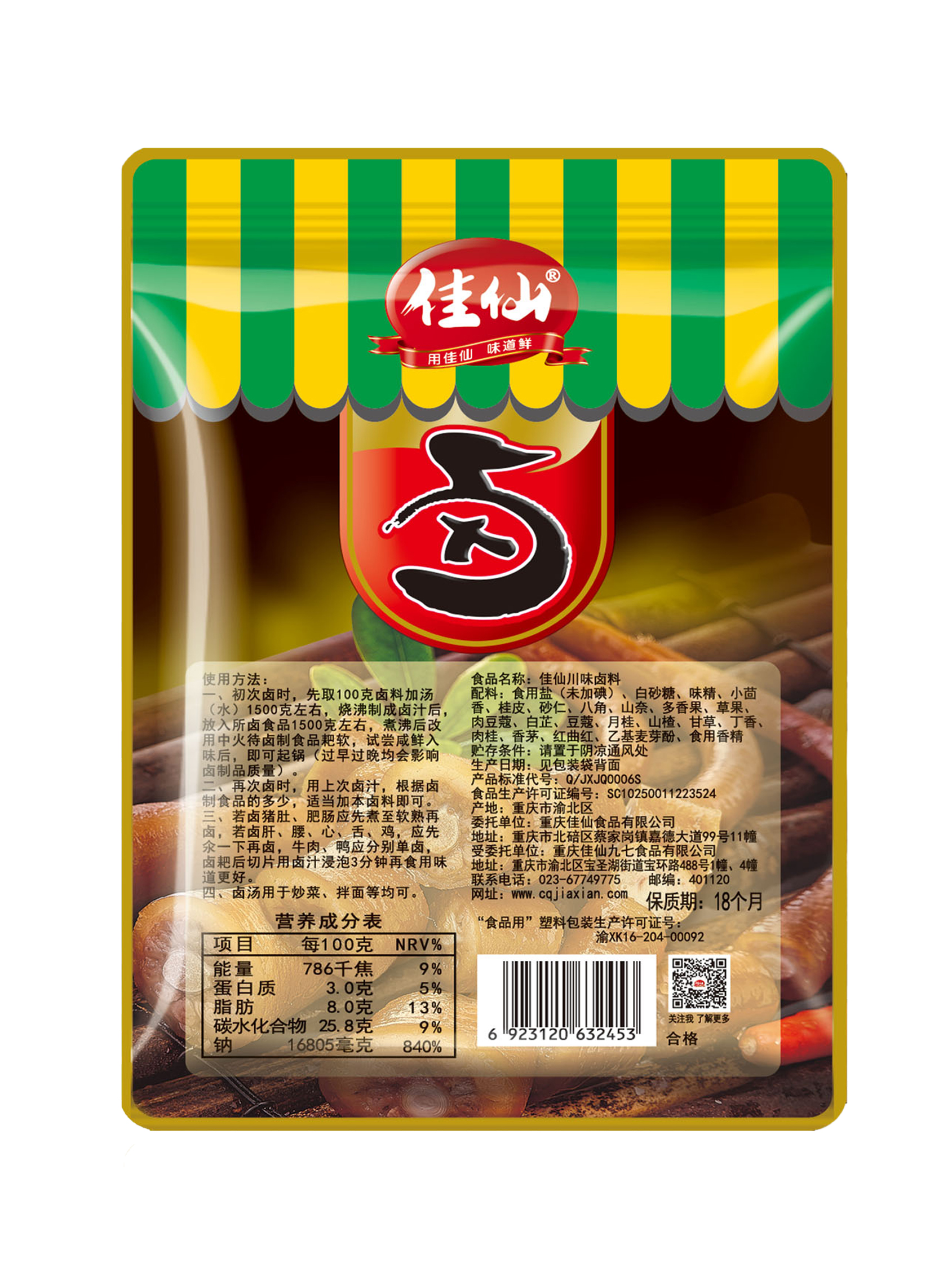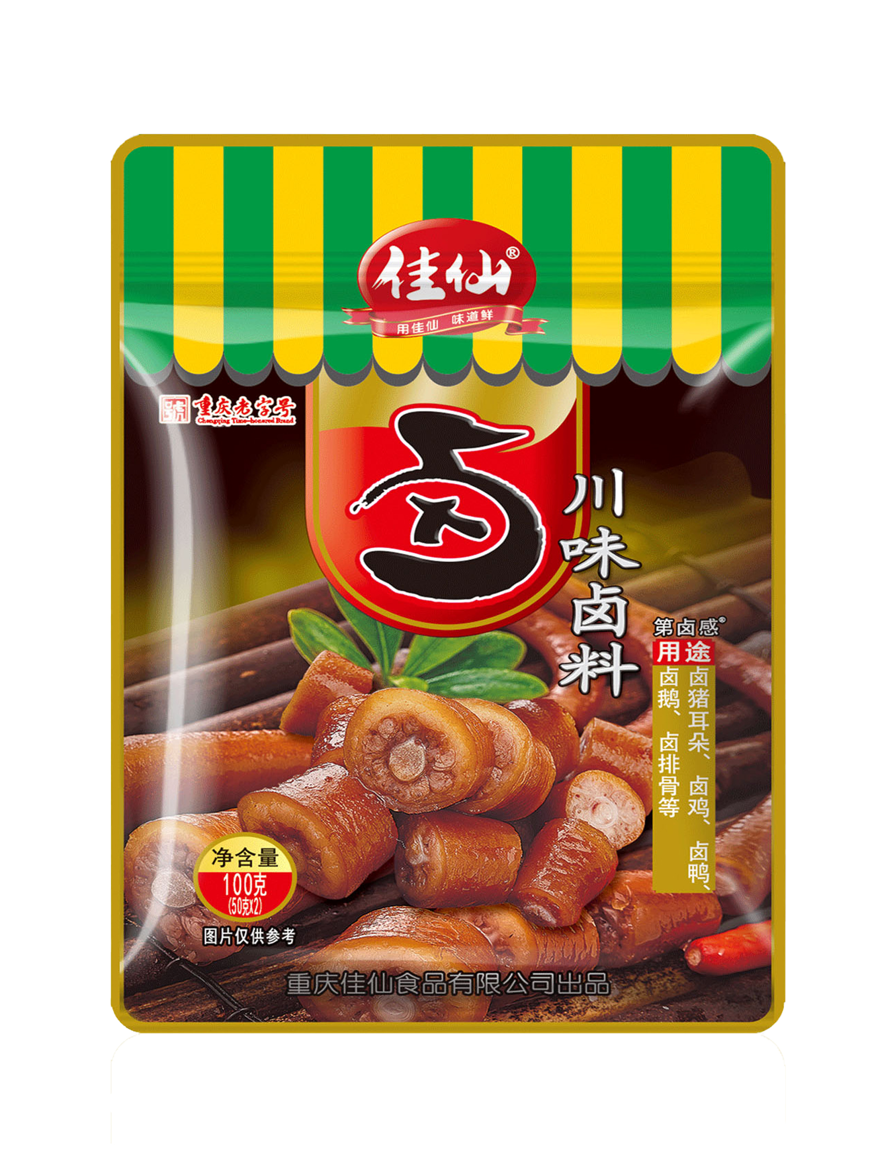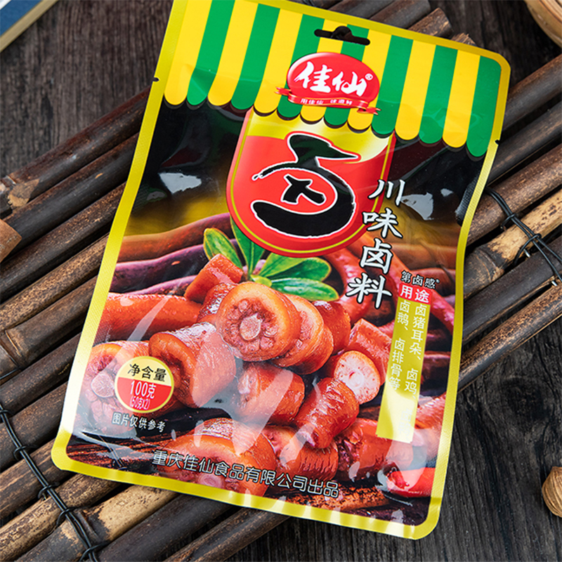 佳仙川味鹵料選用辣椒、桂皮、茴香、肉蔻、八角等十多味香辛料細致配比;地道川味,咸香辛辣,更適合川渝地區的口味;碾碎炒香后細細研磨成粉,濃郁辛香能更滲透食材,鹵后更入味;加水即鹵,廚房小白也能輕松上手;適用于于鹵雞爪、鹵鵝、鹵雞、鹵排骨等。