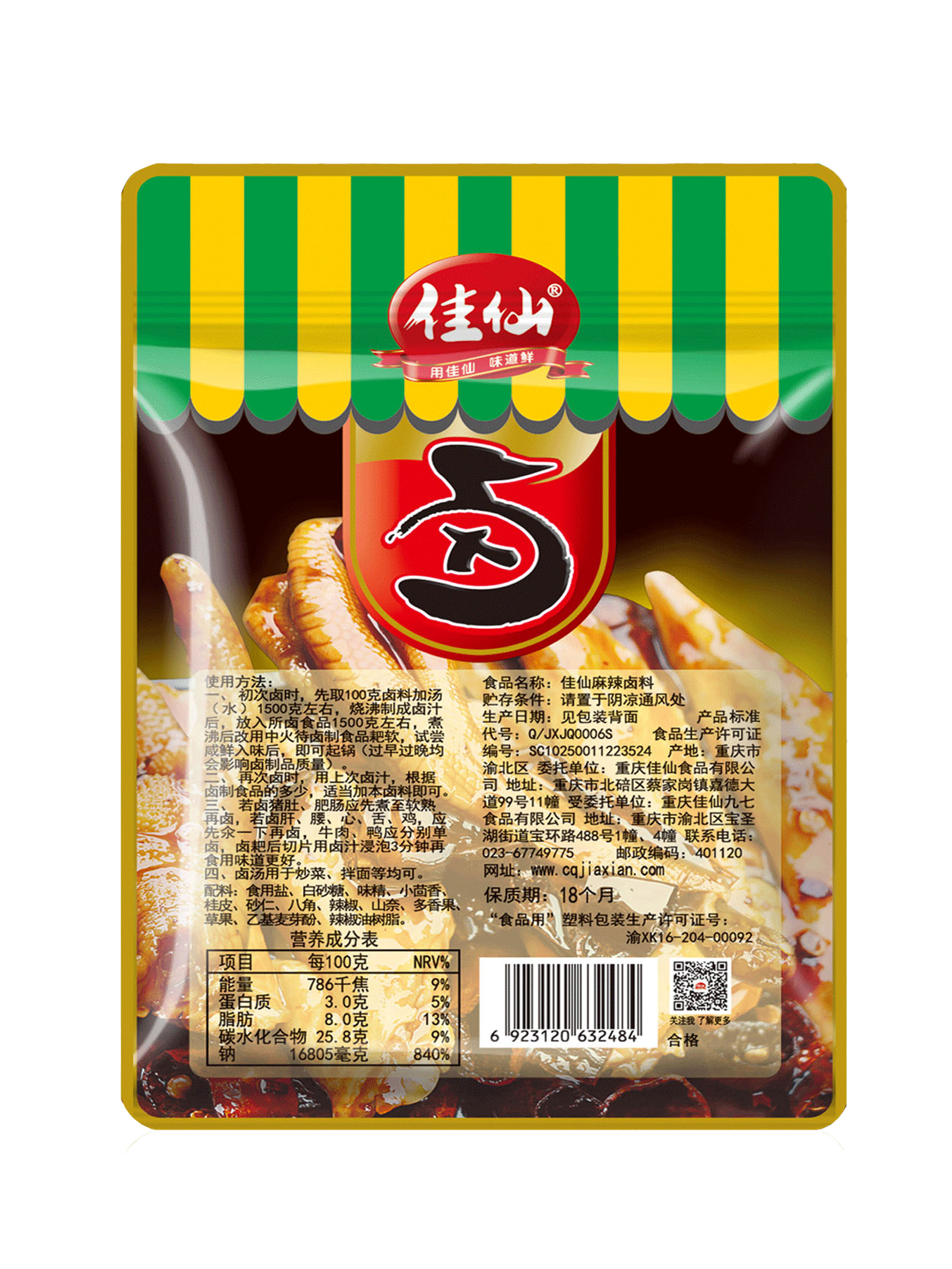 佳仙麻辣鹵料花椒、辣椒、桂皮、茴香、肉蔻、八角等十多味香辛料細致配比;麻辣鮮香,味道更豐富;碾碎炒香后細細研磨成粉,濃郁辛香能更滲透食材,鹵后更入味;加水即鹵,廚房小白也能輕松上手;適用于于鹵雞爪、鹵鵝、鹵雞、鹵排骨等。