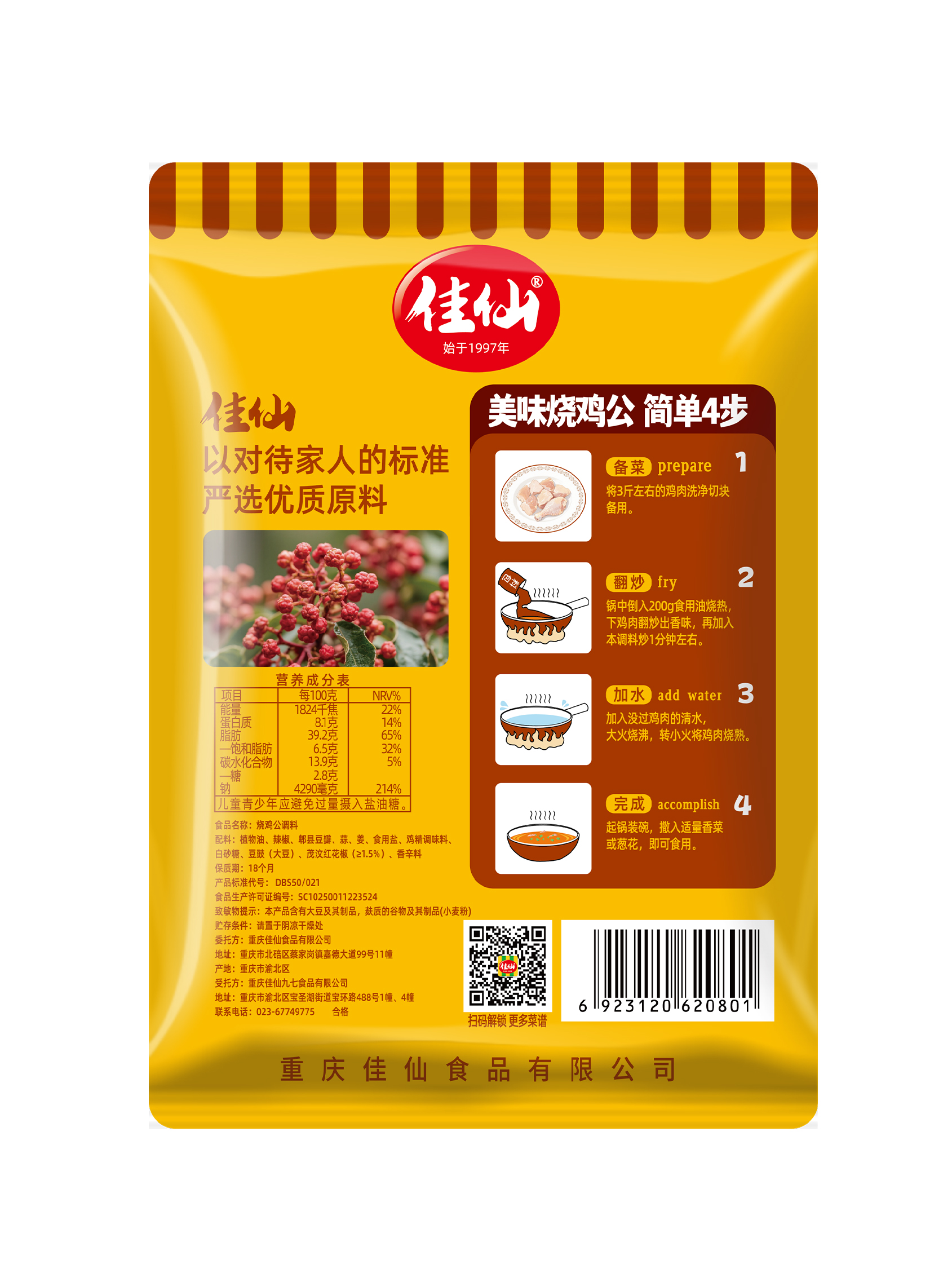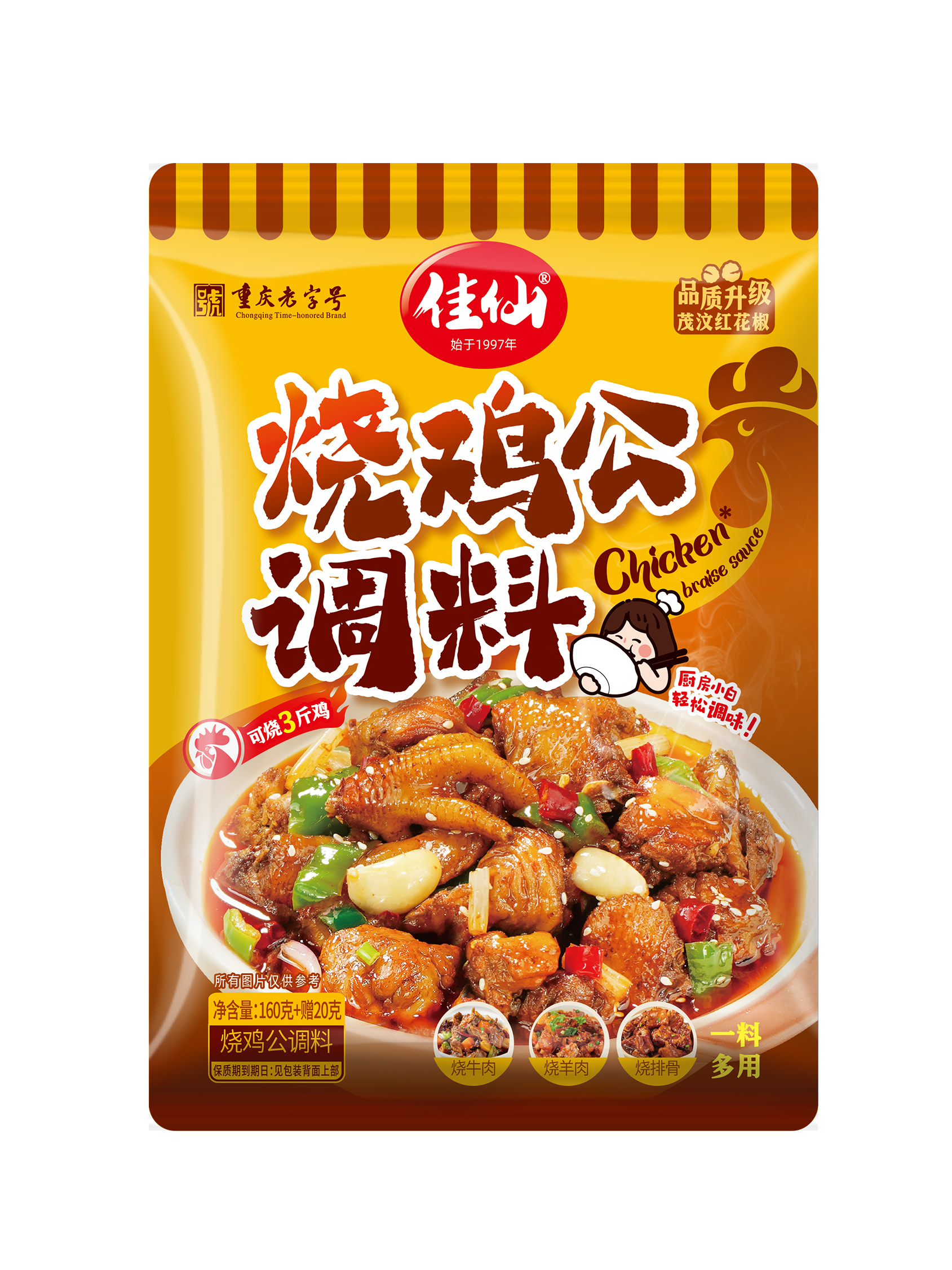 燒雞公調(diào)料160g+20g 系列燒菜系列配料 產(chǎn)品賣點: 大廚秘制配方,將多種調(diào)料匠心配比,一包料可搭配2斤雞肉,0廚藝也能做出麻辣鮮香,肉質(zhì)嫩滑的重慶江湖菜燒雞公,且一料多用還可用于烹飪烹飪燒牛肉、排骨、鴨肉等。 產(chǎn)品賣點: 大廚秘制配方,將多種調(diào)料匠心配比,一包料可搭配2斤雞肉,0廚藝也能做出麻辣鮮香,肉質(zhì)嫩滑的重慶江湖菜燒雞公,且一料多用還可用于烹飪烹飪燒牛肉、排骨、鴨肉等。 淘寶商城 天貓商城 京東商城