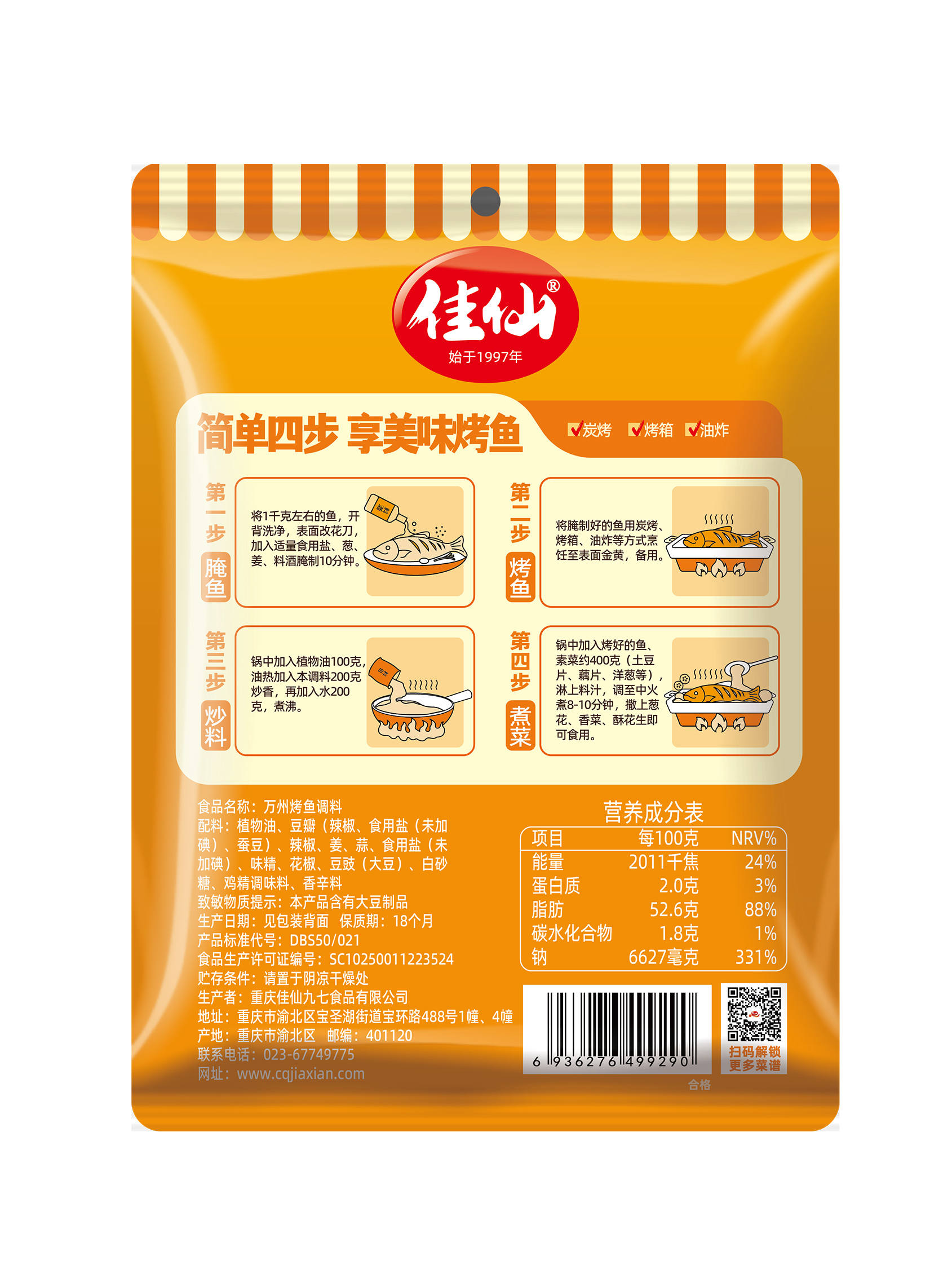 萬州烤魚調料200g 系列燒菜系列配料 產品簡介: 佳仙萬州烤魚調料多種香料煉制而成,醇香味足,熱辣四溢;一袋可烤兩斤魚,在家也能做正宗萬州烤魚。 產品賣點: 一袋可烤兩斤魚,在家做出正宗萬州烤魚。 ? 產品簡介: 佳仙萬州烤魚調料多種香料煉制而成,醇香味足,熱辣四溢;一袋可烤兩斤魚,在家也能做正宗萬州烤魚。 產品賣點: 一袋可烤兩斤魚,在家做出正宗萬州烤魚。 ? 淘寶商城 天貓商城 京東商城