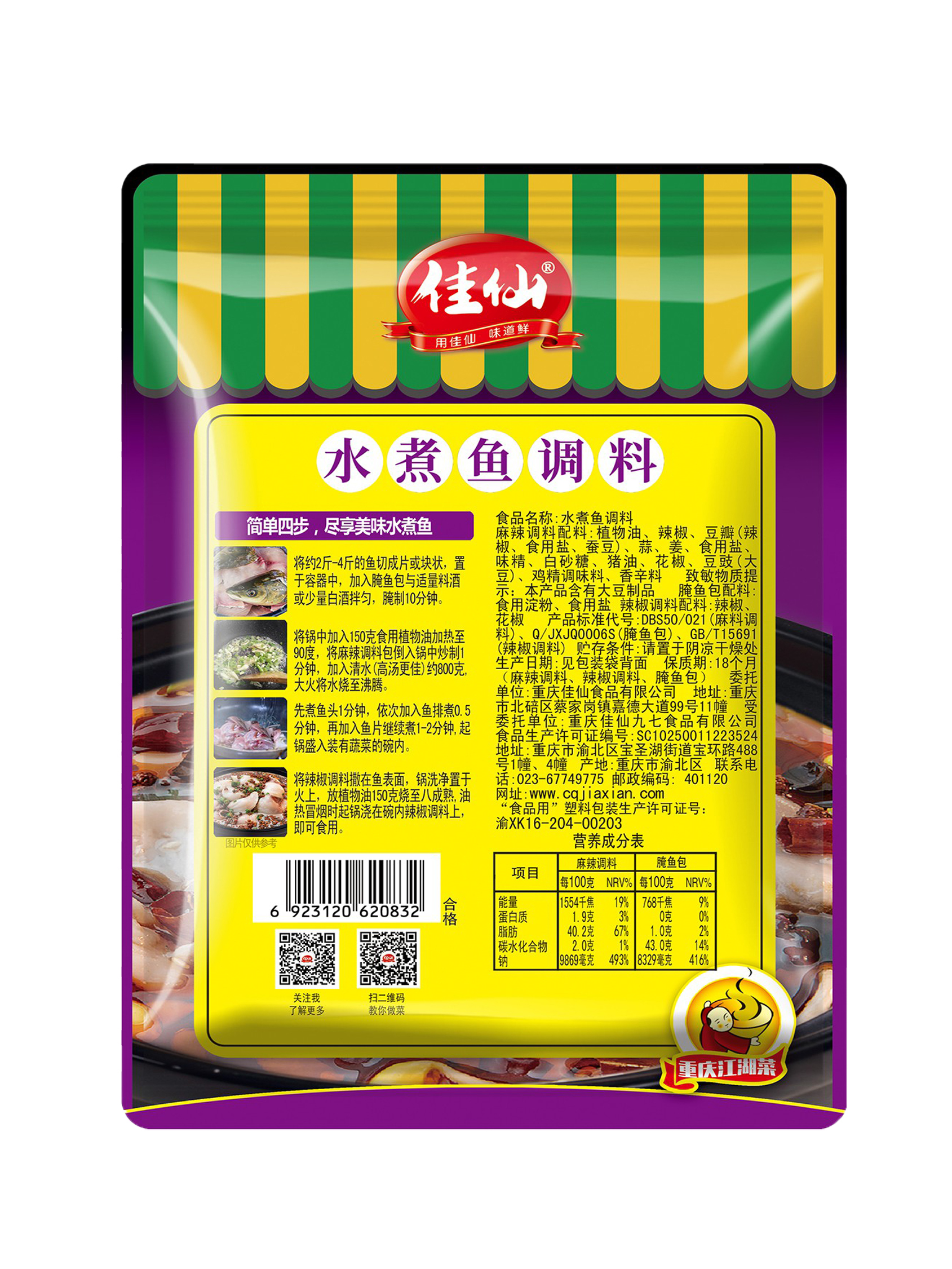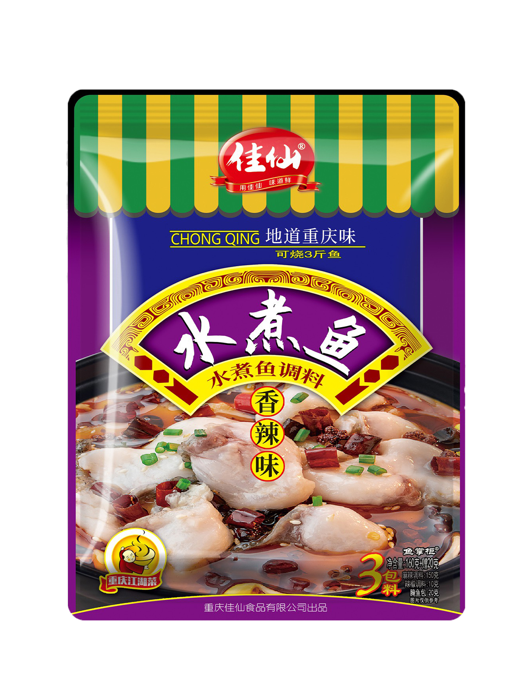 佳仙水煮魚調(diào)料內(nèi)含配料包、腌魚包,辣椒包,共有三包料;一包可燒三斤魚;無需自己腌制魚肉,去腥增香,魚肉滑嫩不渾湯;在家做出地道的重慶江湖菜。