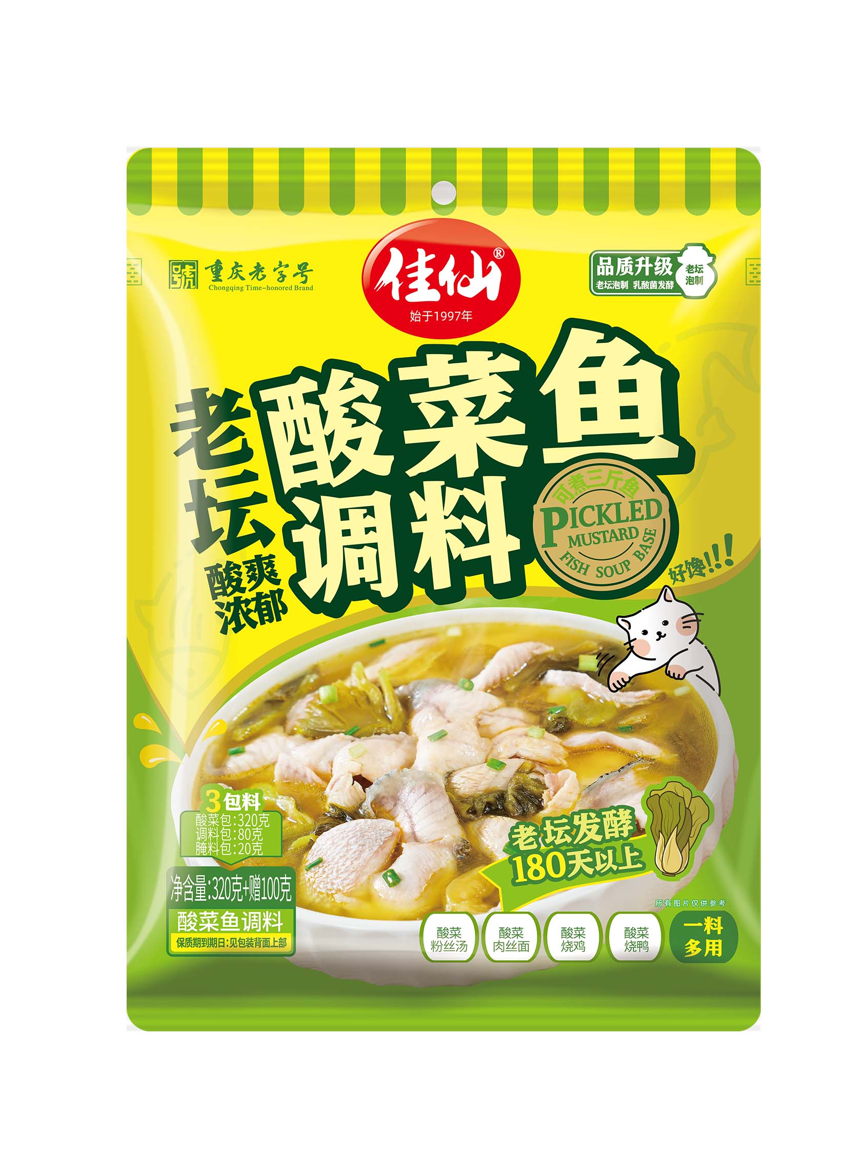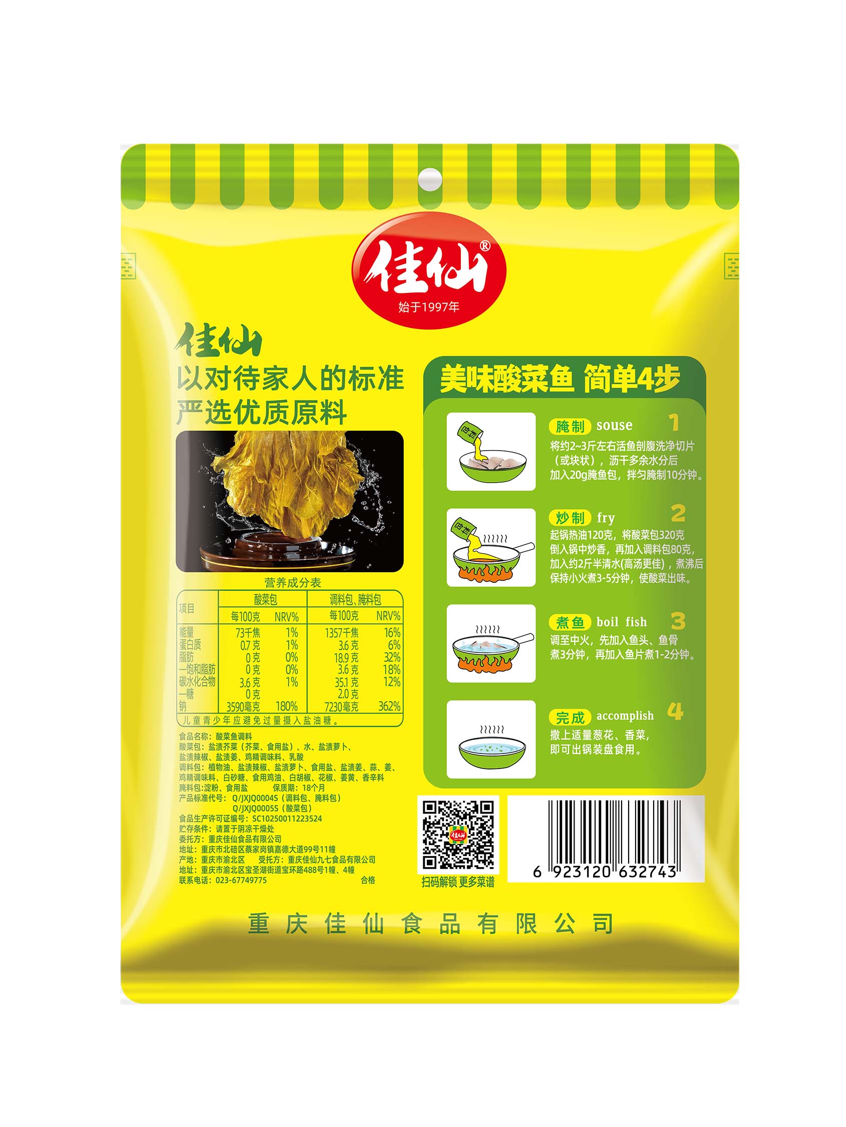 佳仙麻辣魚調料選擇老壇陳泡發酵180天以上的酸菜,酸香撲鼻湯好喝;內含配料包、腌魚包,辣椒包,共有三包料;一包可燒三斤魚;無需自己腌制魚肉,去腥增香,魚肉滑嫩不渾湯;在家做出地道的重慶江湖菜。