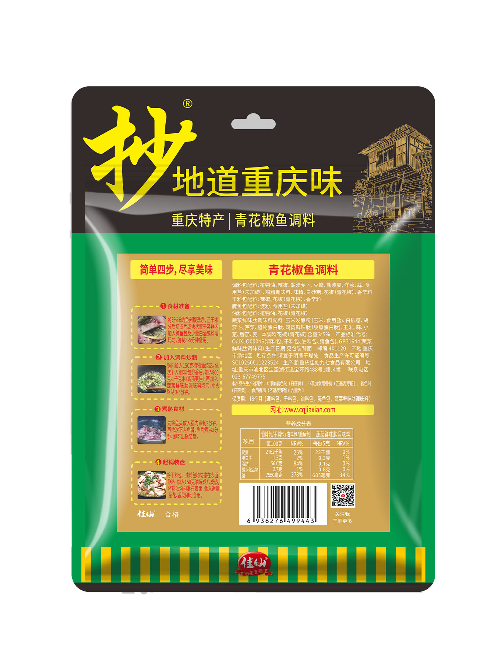 料足量多內含5包料,選用基地直供的江津九葉青花椒配以辣椒、豆瓣、豆豉等多種香辛料制作秘制醬料,并精選青花椒油,使得烹飪的藤椒魚清香鮮麻,滋味純正,操作簡單,4步輕松制作地道重慶味的青花椒魚。還可以用于烹飪青花椒雞、青花椒牛蛙等。