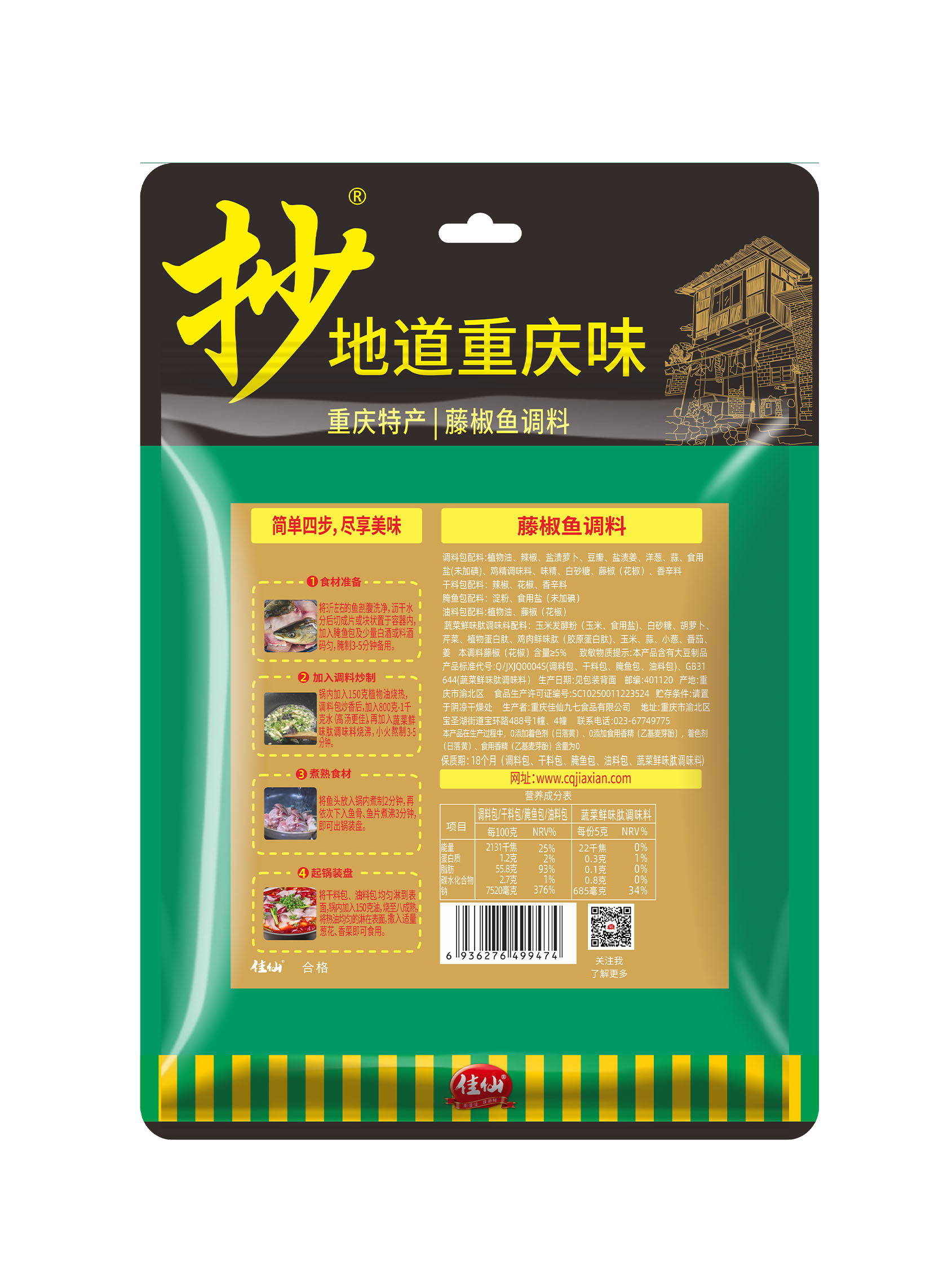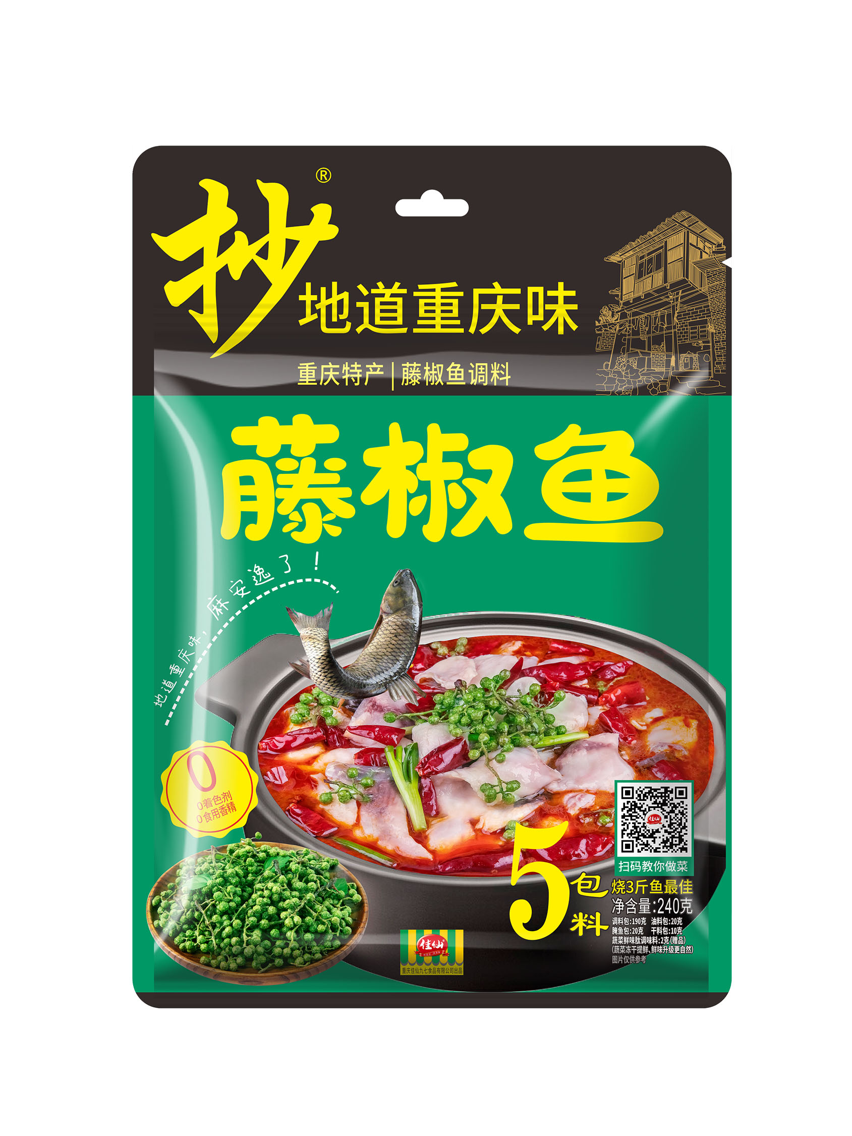 料足量多內(nèi)含5包料,選用基地直供的江津九葉青花椒配以辣椒、豆瓣、豆豉等多種香辛料制作秘制醬料,并精選藤椒油,使得烹飪的藤椒魚麻味更持久,操作簡(jiǎn)單,4步輕松制作地道重慶味的藤椒魚。還可以用于烹飪椒麻雞、藤椒花甲、藤椒肥牛等。