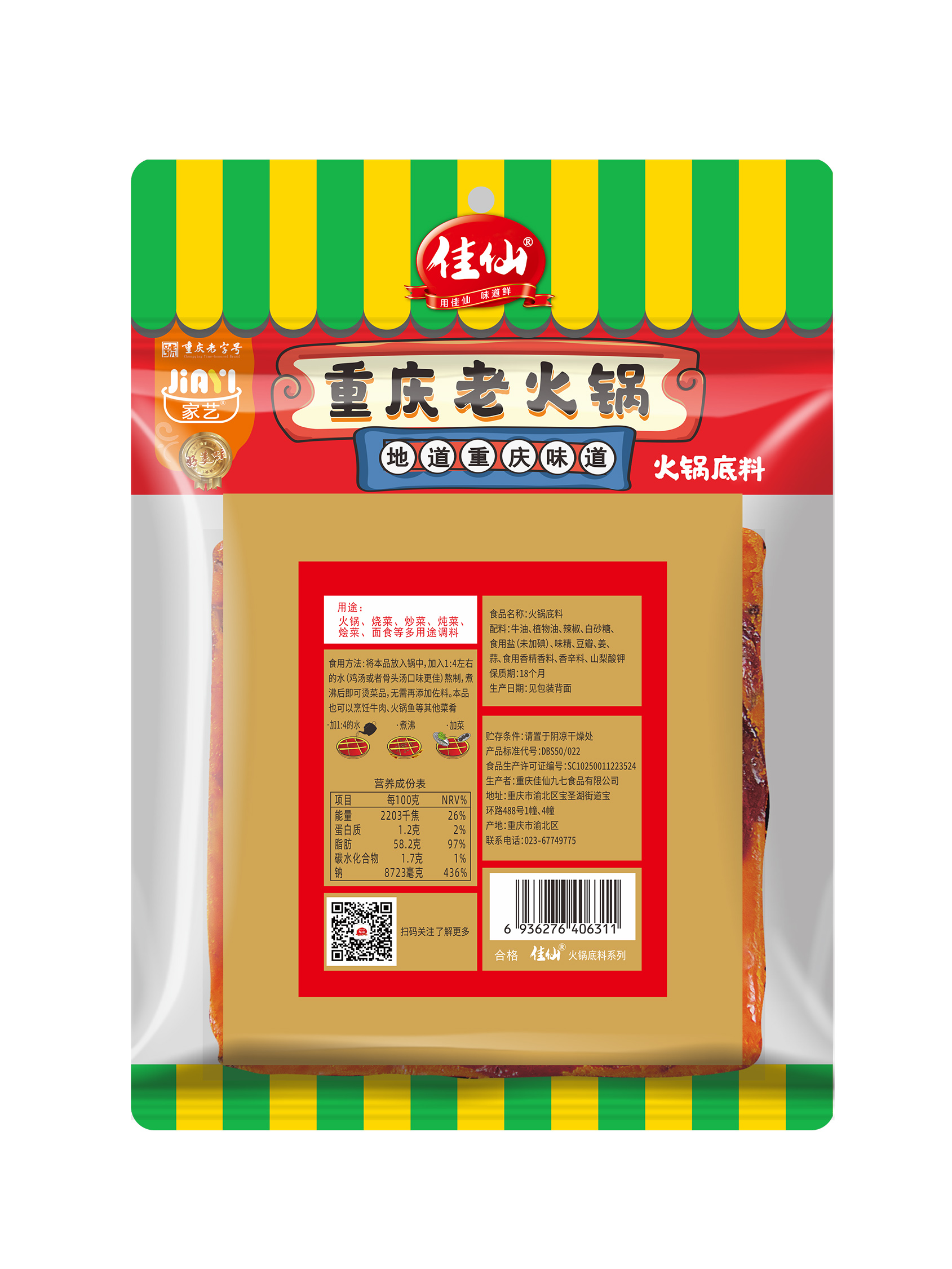 佳仙火鍋底料是重慶非物質(zhì)文化遺產(chǎn),它源起朝天門碼頭的老字號火鍋店,底料配方經(jīng)過三代人的心手相傳延續(xù)至今。抄火鍋底料精選重慶本地產(chǎn)的紅辣椒、花椒、豆瓣、以及十多種香辛料,融合上等牛油,運用獨家秘方熬制6小時以上。將新油熬出了老油的口感,還原了地道的重慶味。具有辣而不燥,麻辣并重,香醇濃郁,久煮不渾,回味悠長的特點。