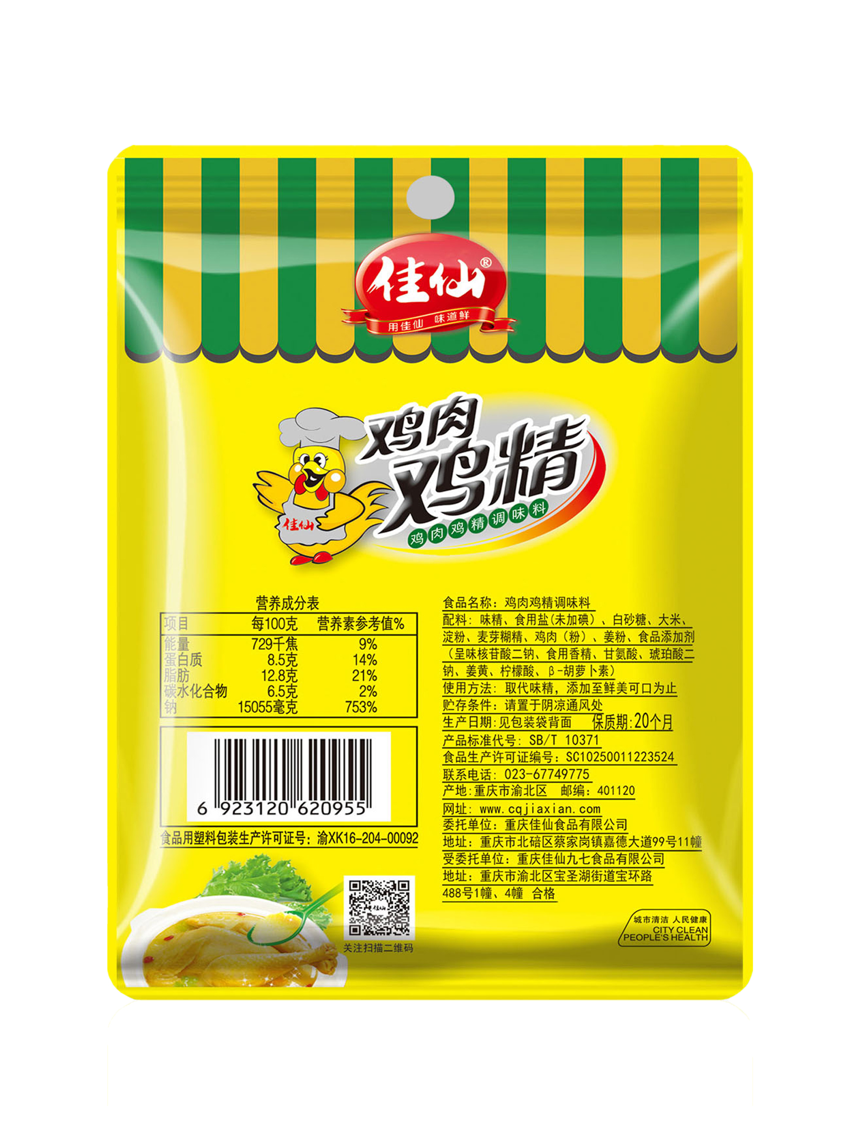 佳仙雞肉雞精50g 系列佳仙雞精配料白糖、淀粉、雞肉... 產品賣點: 以鮮雞為原料,嚴選雞肉萃取干燥加工制成,雞香風味飽滿,腌炒蒸煮時適量使用讓菜肴自然提鮮,更加美味。可用于炒菜、煲湯、火鍋、蒸菜、拌餡等 產品賣點: 以鮮雞為原料,嚴選雞肉萃取干燥加工制成,雞香風味飽滿,腌炒蒸煮時適量使用讓菜肴自然提鮮,更加美味。可用于炒菜、煲湯、火鍋、蒸菜、拌餡等 淘寶商城 天貓商城 京東商城