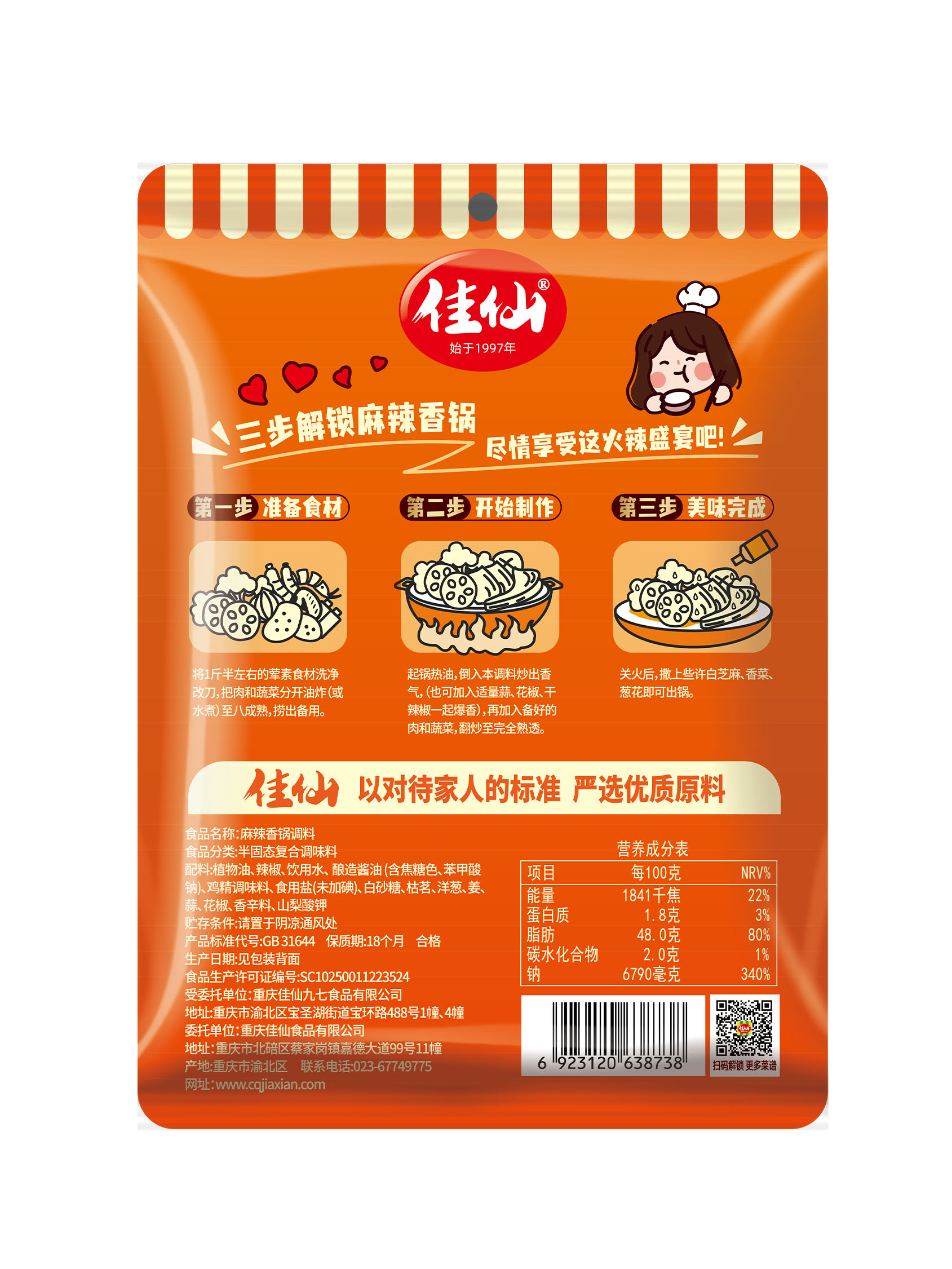 麻辣香鍋80g 系列配料 產(chǎn)品賣點(diǎn): 大廚秘制配方,將多種調(diào)料匠心配比,香味醇厚、麻辣過癮、料足味足,一包調(diào)料可以搭配750克葷素食材,無需高超的廚藝就能做出媲美餐廳味道的川味麻辣香鍋。 產(chǎn)品賣點(diǎn): 大廚秘制配方,將多種調(diào)料匠心配比,香味醇厚、麻辣過癮、料足味足,一包調(diào)料可以搭配750克葷素食材,無需高超的廚藝就能做出媲美餐廳味道的川味麻辣香鍋。 淘寶商城 天貓商城 京東商城