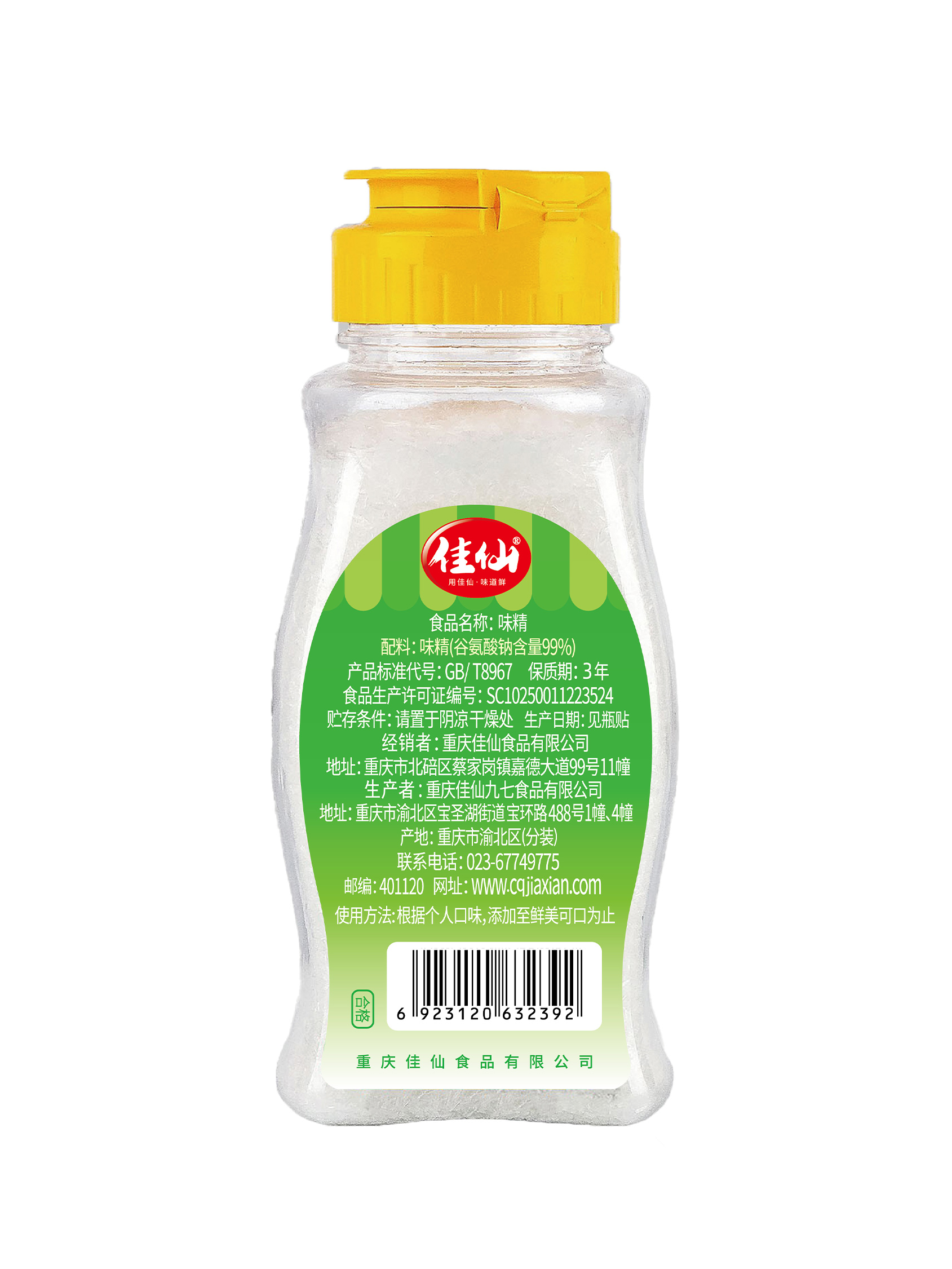 佳仙瓶裝味精125g 系列佳仙味精 配料玉米發酵 產品簡介: 佳仙瓶裝味精精選優質原料,玉米釀制而成;谷氨酸鈉的含量達到99%以上;顆粒質地,瓶裝易拿取更方便; 產品賣點: 谷物釀制,99%的提純度,瓶裝更方便。 ? ? 產品簡介: 佳仙瓶裝味精精選優質原料,玉米釀制而成;谷氨酸鈉的含量達到99%以上;顆粒質地,瓶裝易拿取更方便; 產品賣點: 谷物釀制,99%的提純度,瓶裝更方便。 ? ? 淘寶商城 天貓商城 京東商城