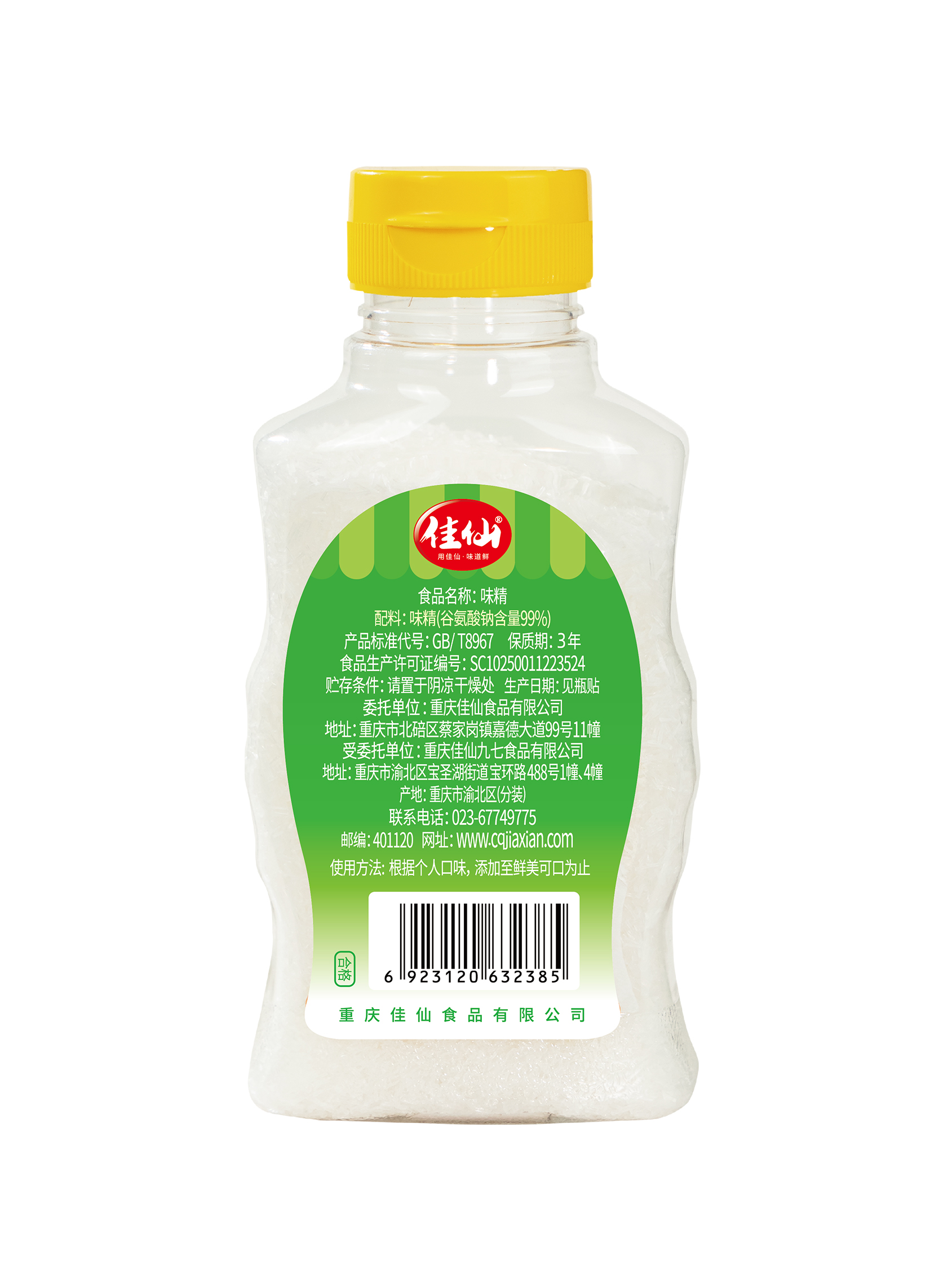 佳仙瓶裝味精220g 系列佳仙味精配料 產品簡介: 佳仙瓶裝味精精選優質原料,玉米釀制而成;谷氨酸鈉的含量達到99%以上;顆粒質地,瓶裝易拿取更方便; 產品賣點: 谷物釀制,99%的提純度,瓶裝更方便。 產品簡介: 佳仙瓶裝味精精選優質原料,玉米釀制而成;谷氨酸鈉的含量達到99%以上;顆粒質地,瓶裝易拿取更方便; 產品賣點: 谷物釀制,99%的提純度,瓶裝更方便。 淘寶商城 天貓商城 京東商城