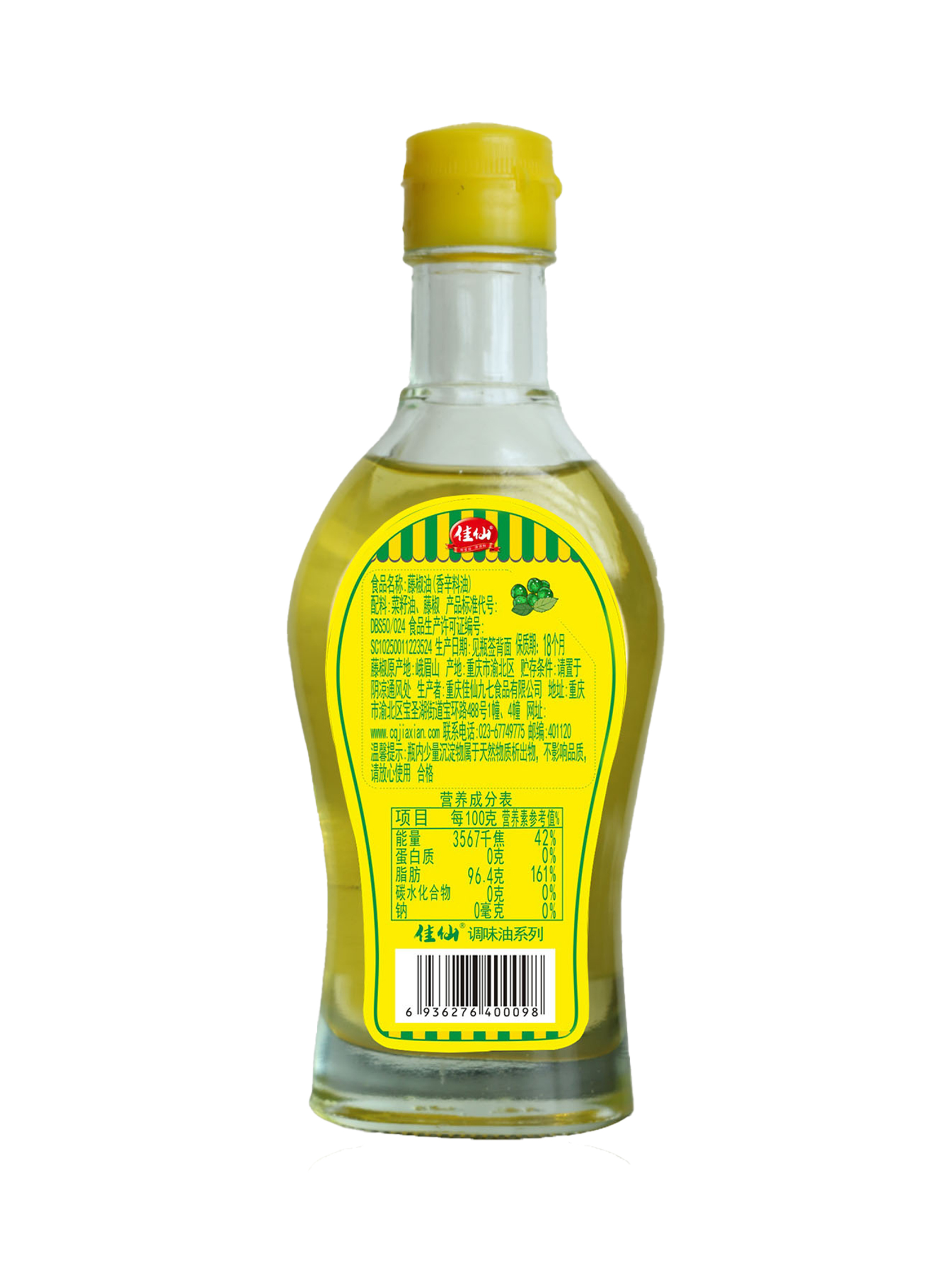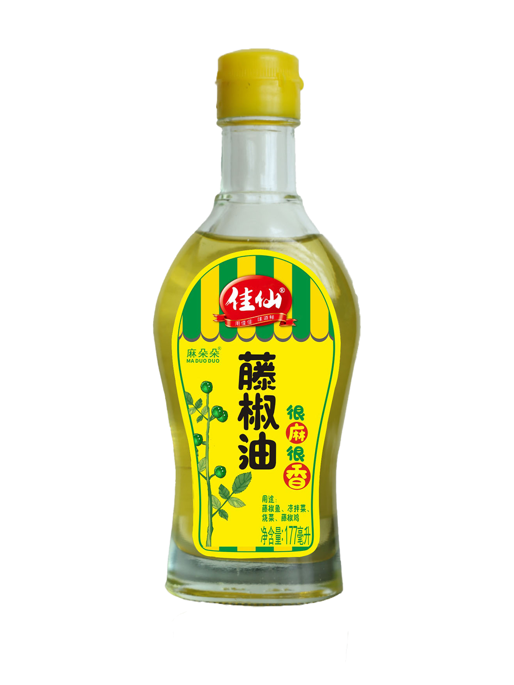 佳仙藤椒油使用雅安出產的鮮藤椒,與非轉基因菜籽油一起高溫熱煉;配料只有藤椒、菜籽油,100%純天然,無任何添加劑;多道工序反復過濾,油汁清亮澄凈,出油保留藤椒特有清香,清麻爽口。