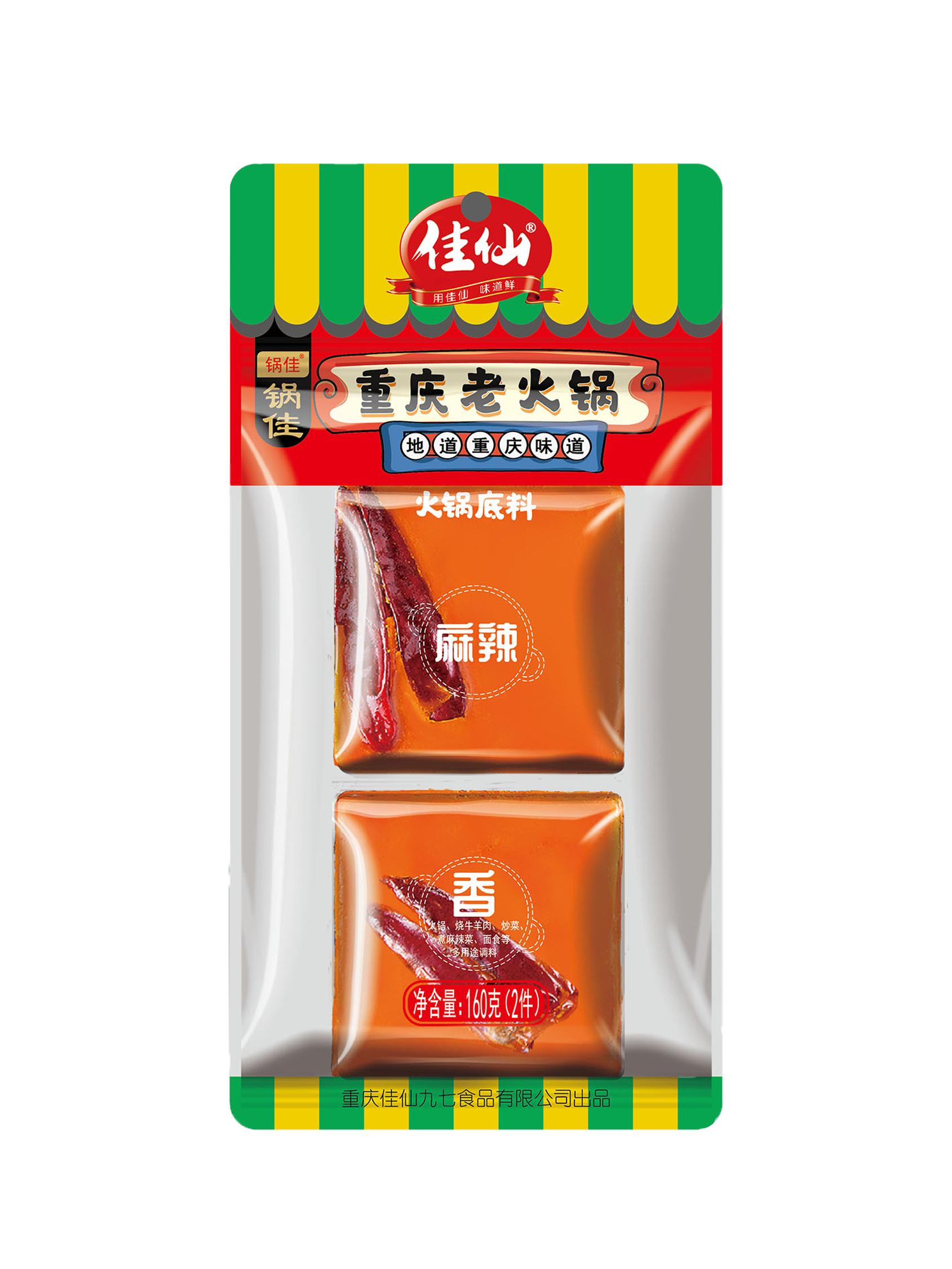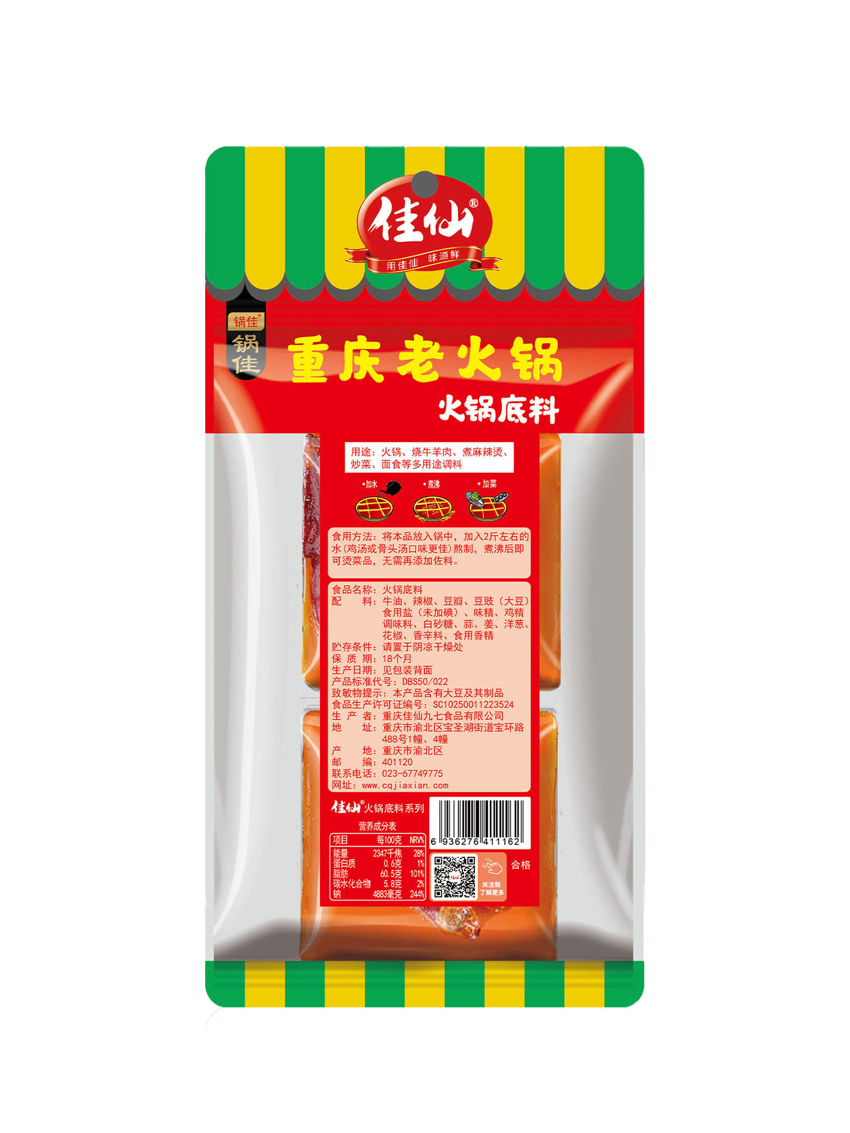 佳仙火鍋底料是重慶非物質(zhì)文化遺產(chǎn),它源起朝天門(mén)碼頭的老字號(hào)火鍋店,底料配方經(jīng)過(guò)三代人的心手相傳延續(xù)至今。抄火鍋底料精選重慶本地產(chǎn)的紅辣椒、花椒、豆瓣、以及十多種香辛料,融合上等牛油,運(yùn)用獨(dú)家秘方熬制6小時(shí)以上。將新油熬出了老油的口感,還原了地道的重慶味。具有辣而不燥,麻辣并重,香醇濃郁,久煮不渾,回味悠長(zhǎng)的特點(diǎn)。