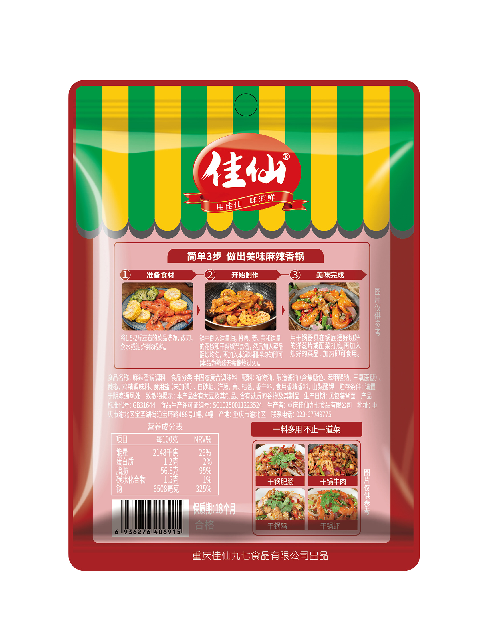 麻辣香鍋78g 系列配料 產品賣點: 大廚秘制配方,將多種調料匠心配比,香味醇厚、麻辣過癮、料足味足,一包調料可以搭配750克葷素食材,無需高超的廚藝就能做出媲美餐廳味道的川味麻辣香鍋。 產品賣點: 大廚秘制配方,將多種調料匠心配比,香味醇厚、麻辣過癮、料足味足,一包調料可以搭配750克葷素食材,無需高超的廚藝就能做出媲美餐廳味道的川味麻辣香鍋。 淘寶商城 天貓商城 京東商城