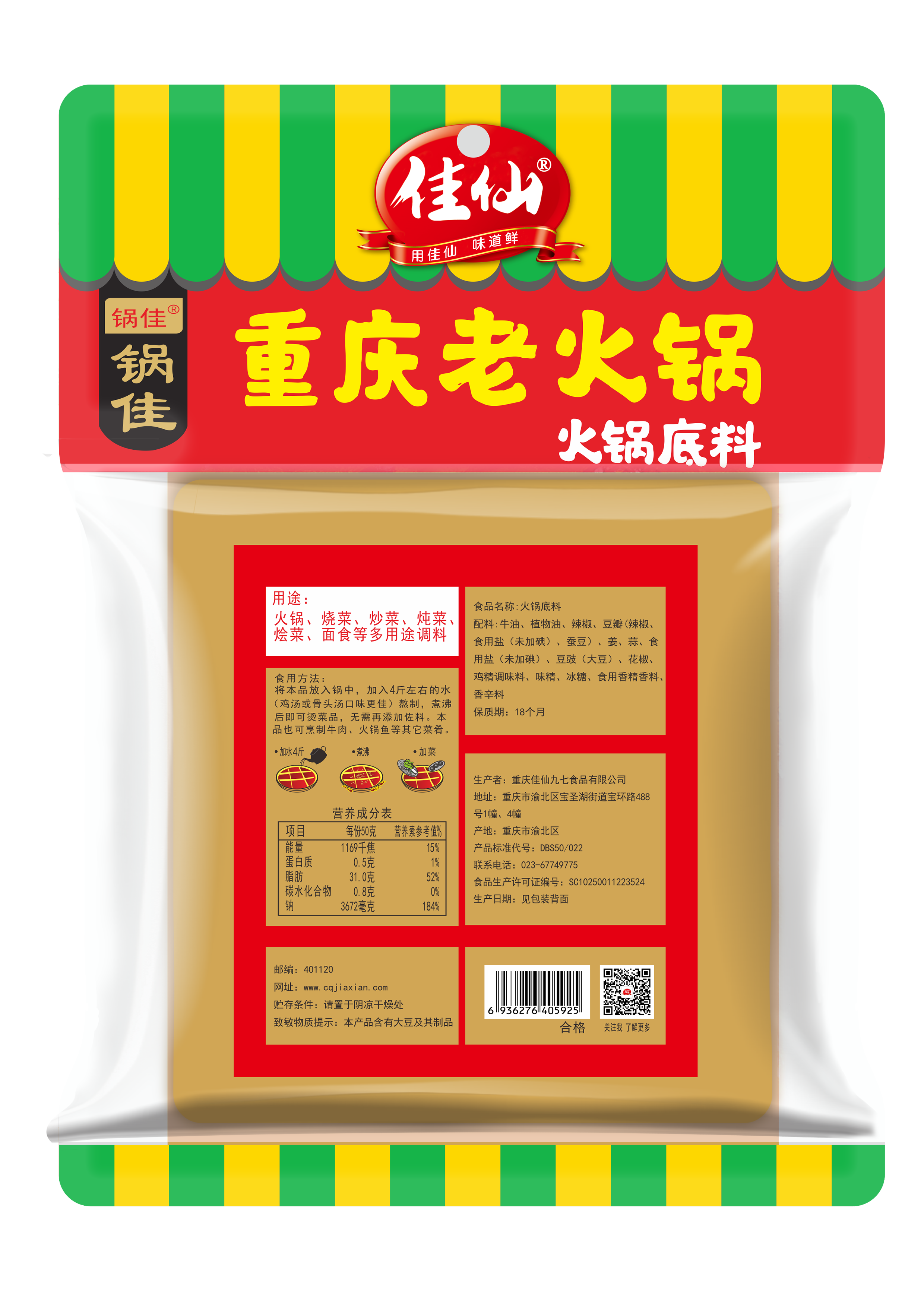 佳仙火鍋底料是重慶非物質文化遺產,它源起朝天門碼頭的老字號火鍋店,底料配方經過三代人的心手相傳延續至今。抄火鍋底料精選重慶本地產的紅辣椒、花椒、豆瓣、以及十多種香辛料,融合上等牛油,運用獨家秘方熬制6小時以上。將新油熬出了老油的口感,還原了地道的重慶味。具有辣而不燥,麻辣并重,香醇濃郁,久煮不渾,回味悠長的特點。