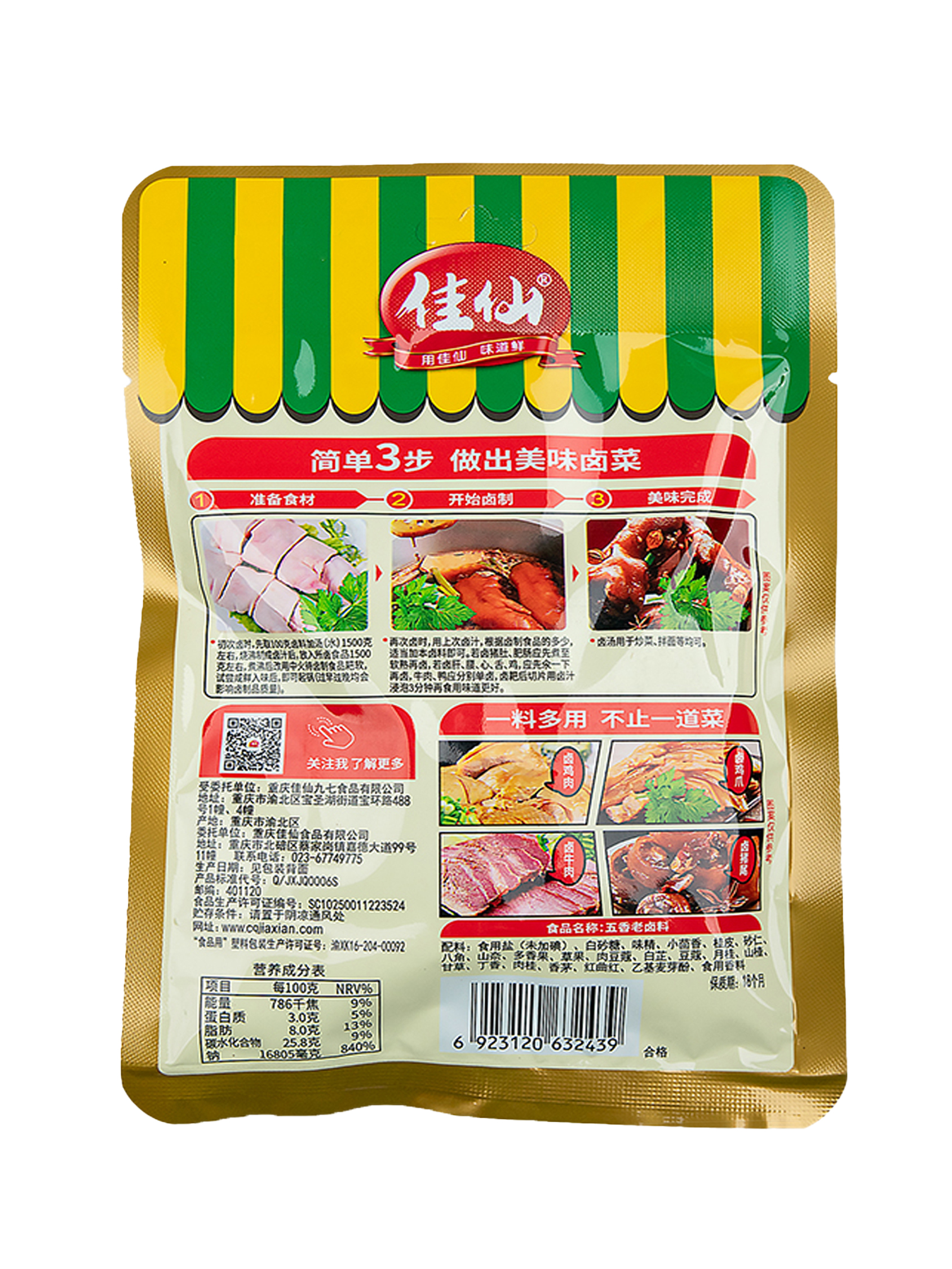 五香老鹵料100g 系列配料 產(chǎn)品賣點: 嚴選22種料,慢熬8小時,熬出五香風味的老鹵味道,濾渣同時保留香辛料味道不流失,無需炒糖色或添加其他調(diào)料,操作簡單方便快捷加水即鹵,葷素皆宜。最快5分鐘即可入味,美味無需等待。 產(chǎn)品賣點: 嚴選22種料,慢熬8小時,熬出五香風味的老鹵味道,濾渣同時保留香辛料味道不流失,無需炒糖色或添加其他調(diào)料,操作簡單方便快捷加水即鹵,葷素皆宜。最快5分鐘即可入味,美味無需等待。 淘寶商城 天貓商城 京東商城